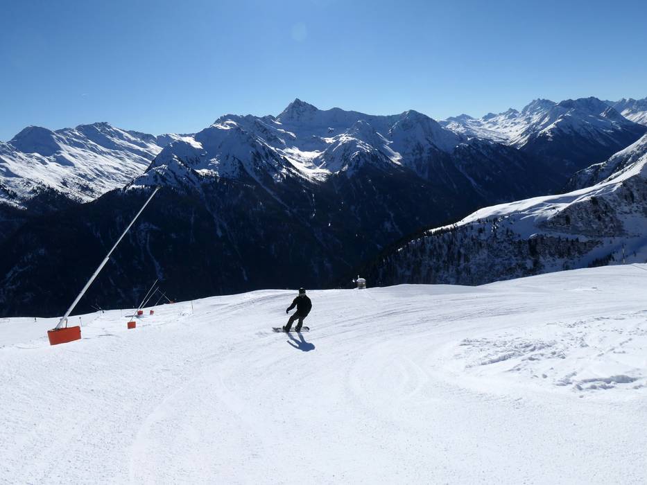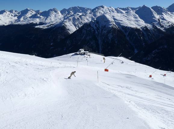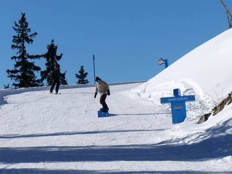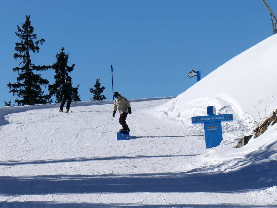 Der Erlebnispark an der Bergstation der 10er-Gondelbahn Dias bietet einige Snowpark-Elemente und Spaß für die ganze Familie.
