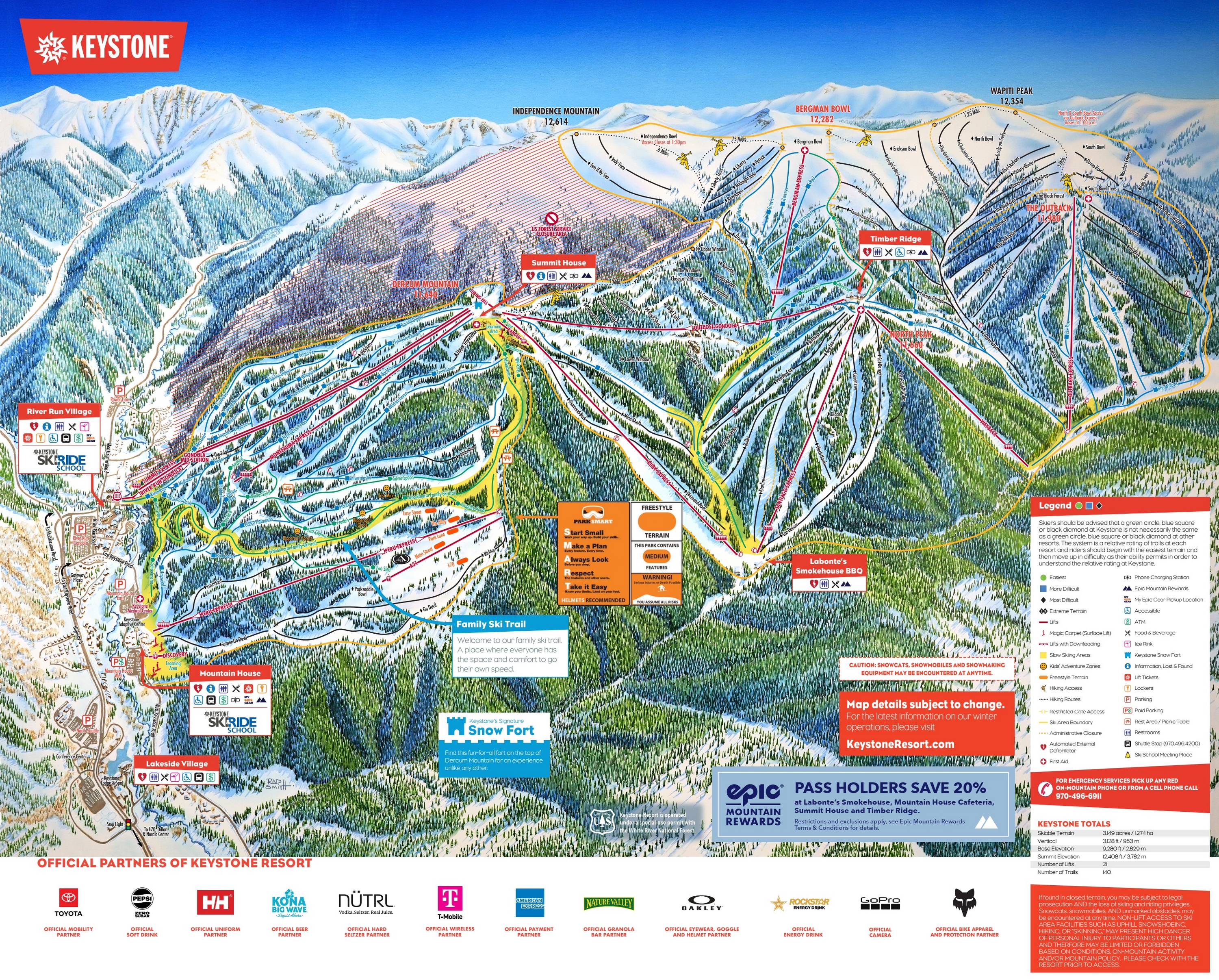Orientierung (Pistenplan, Informationstafeln, Ausschilderung) und Sicherheit im Skigebiet Keystone