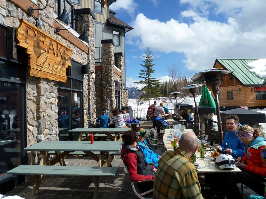Der Peaks Grill bietet typische kanadisches Essen und kaltes Bier. Bei schönem Wetter lockt die Terrasse mit Blick auf das Skigebiet Kicking Horse.