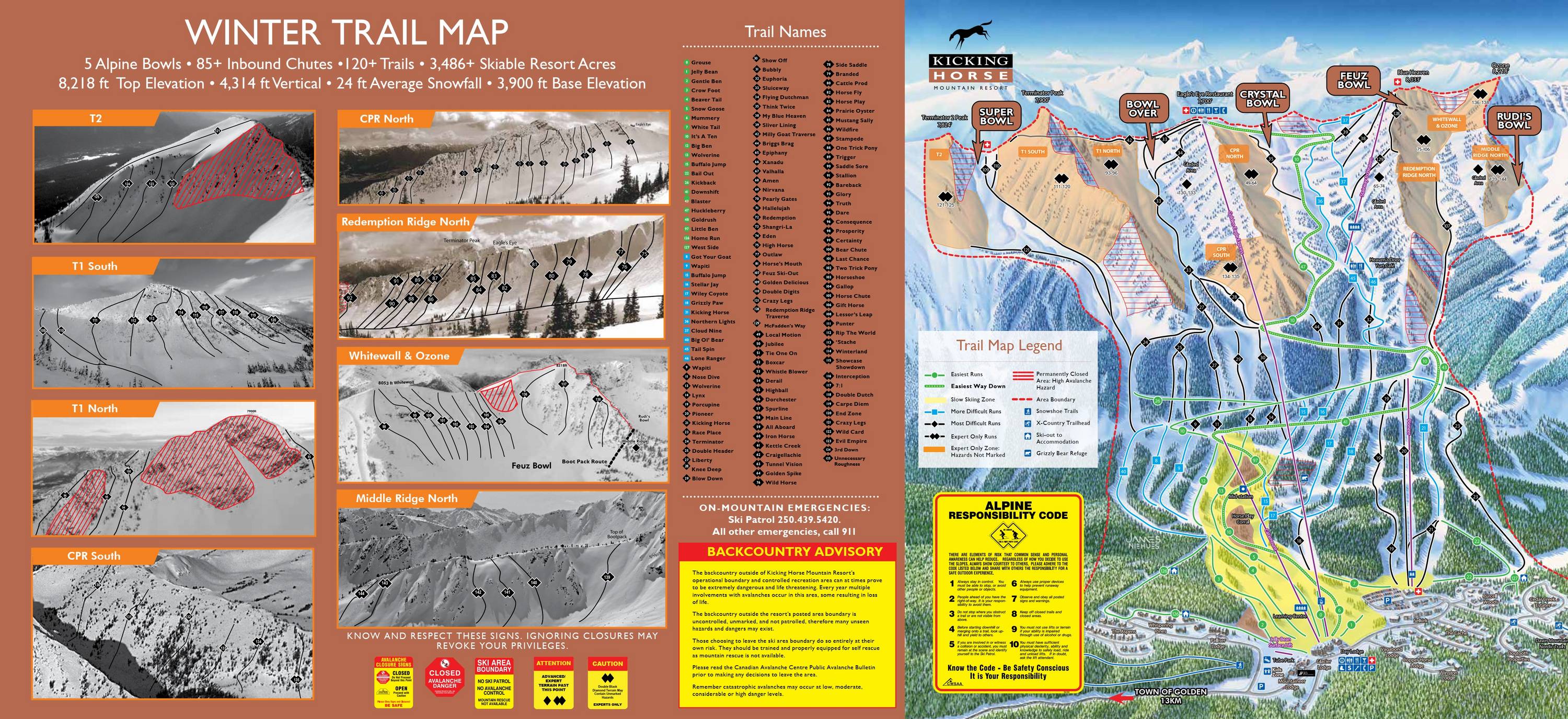 Der Pistenplan stellt das Skigebiet von Kicking Horse sehr gut dar. Es sind alle Lifte, Pisten, Restaurants und Unterkunftsmöglichkeiten eingezeichnet. Jede der Abfahrten ist mit Nummer und Name ausgezeichnet. Man findet sich somit immer gut im Skigebiet zurecht.