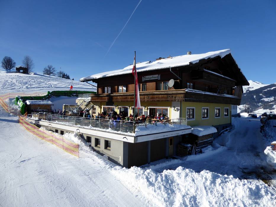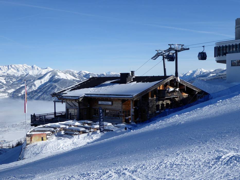 Die Sauloch Alm bietet eine große Sonnenterrasse, klassische Skifahreressen und regionale Pinzgauer Kost.