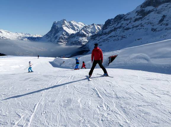 Grindelwald und Wengen bieten ideale Voraussetzungen für die Anfänger. Direkt unterhalb der Kleinen Scheidegg (von Grindelwald und Wengen bequem mit der Zahnradbahn zu erreichen) gibt es den großen Beginner's Park Kleine Scheidegg mit überdachtem Förderband und Seilliften. Auf dem Männlichen (von Grindelwald und Wengen bequem mit der Seilbahn zu erreichen) können die Anfänger an zwei Übungsliften und einem Förderband im Kinderparadies Männlichen die ersten Schwünge üben. Direkt in Wengen gibt es ein Anfängergelände mit zwei Seilliften. Die Schweizer Ski- und Snowboardschule Wengen betreibt ein eigenes Anfängergelände mit Förderbändern. Von der Kleinen Scheidegg führen mehrere leichte Pisten über Alpiglen und Brandegg hinunter bis nach Grindelwald. Diese sind sehr lang und gut für Anfänger zu meistern. In Richtung Wengen haben die Anfänger bis zur Wengernalm ideale Pisten. Weiter hinunter nach Wengen wird die Piste dann mittelschwer und die Anfänger sollten die Zahnradbahn wieder ins Tal nehmen. Auf dem Männlichen finden Anfänger zwei leichte Pisten an den Vierersesselbahnen Läger und Männlichen vor. Eine davon ist die Wasserwendi Slow-Slope (spezielle Piste für langsames Fahren). Die Talabfahrt vom Männlichen nach Grindelwald ist für Anfänger nicht zu empfehlen.