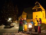 Nach der vereinten nächtlichen Bergfahrt mit der Montafoner Kristbergbahn geht es ganz gemütlich die ca. 250 Meter bis an die Bergknappenkappelle St. Agatha, wo es die ersten Sagen und Geschichten gibt. Als wärmenden Zwischengang gibt es ein heißes alkoholisches bzw. alkoholfreies Getränk aus dem Kupferkessel beim Bergknappenbrunnen. Anschließend geht es in die warme Stube vom Panoramagasthof Kristberg, wo Geschichte in Geschichten und eine feine 3-gängige kulinarische Reise ins frühzeitliche Montafon sich abwechseln.