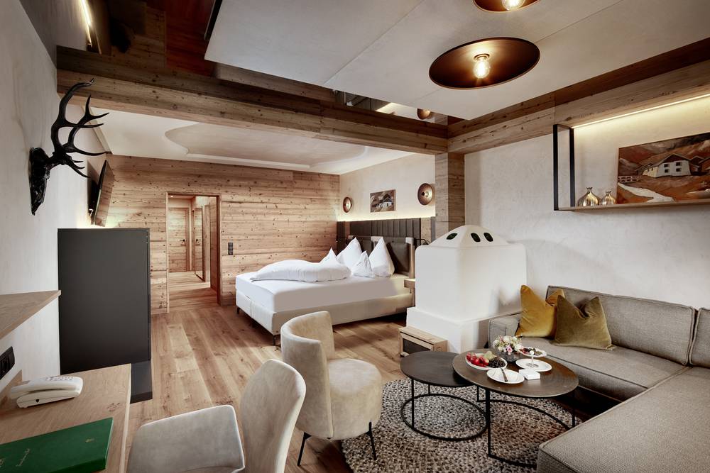 Das Hotel verfügt über insgesamt 70 Zimmer, Suiten und Appartements, die im Tiroler Stil mit viel Fichte und Zirbe eingerichtet sind. Jedes der Zimmer ist individuell und liebevoll ausgestattet. Alte Gemälde zieren die Wände. Antike Bauernschränke und -truhen künden von der Handwerkstradition der Region. Selten gewordene Holzschnitzereien sowie handgefertigte Vertäfelungen sorgen für eine behagliche Atmosphäre im gesamten Haus.