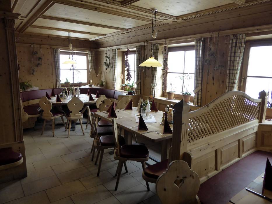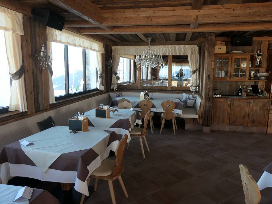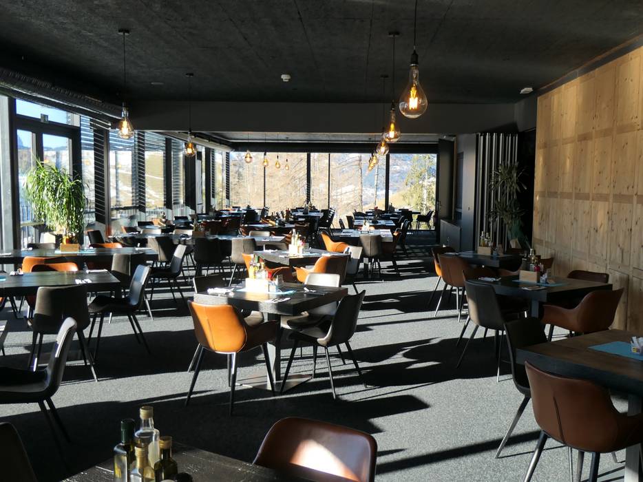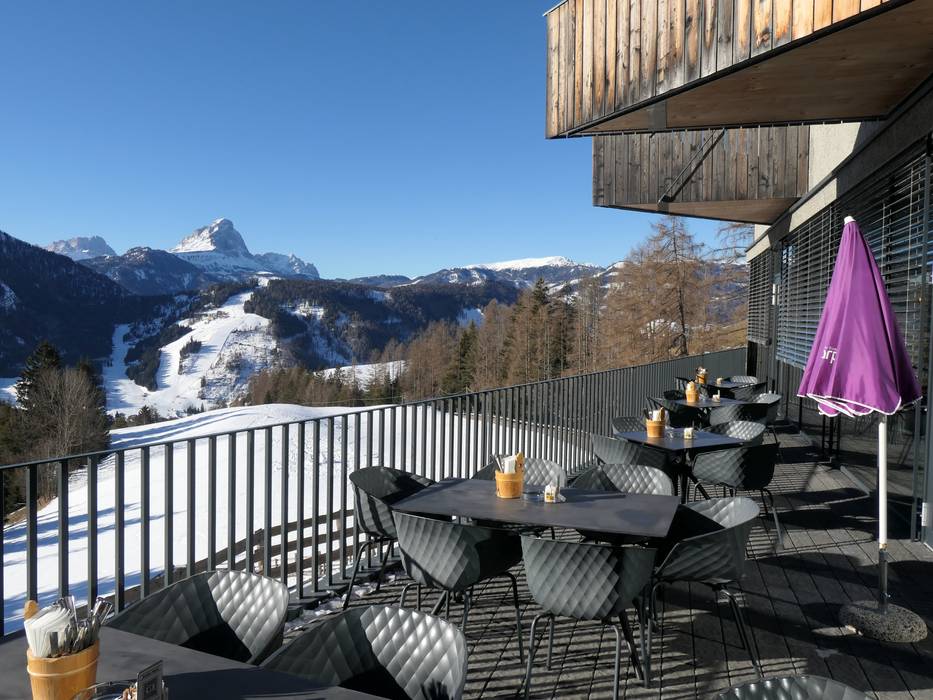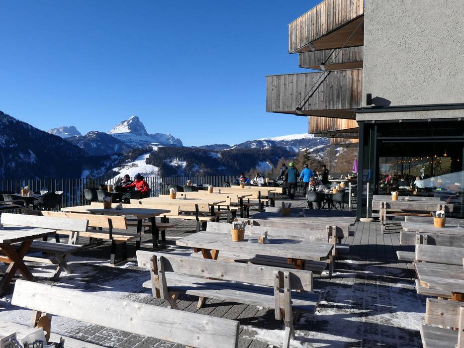 Das Restaurant befindet sich im Hotel Spaces. Die verglaste Fensterfront und die Sonnenterrasse bieten einen Ausblick auf die Dolomitengipfel. Bei den Speisen steht die Qualität im Vordergrund.