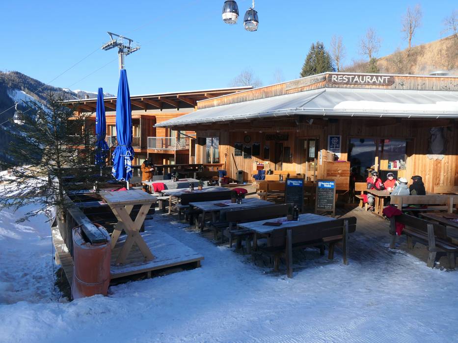 Die Herzlalm ist eine große und gemütliche Hütte mit Sonnenterrasse und Blick auf die Pisten. Es gibt einen bedienten Teil und einen Selbstbedienungsbereich. Für eine kurze Pause kann man auch an der Bar Platz nehmen.