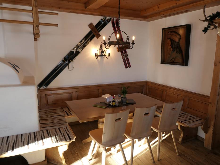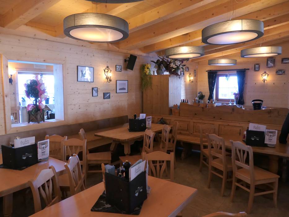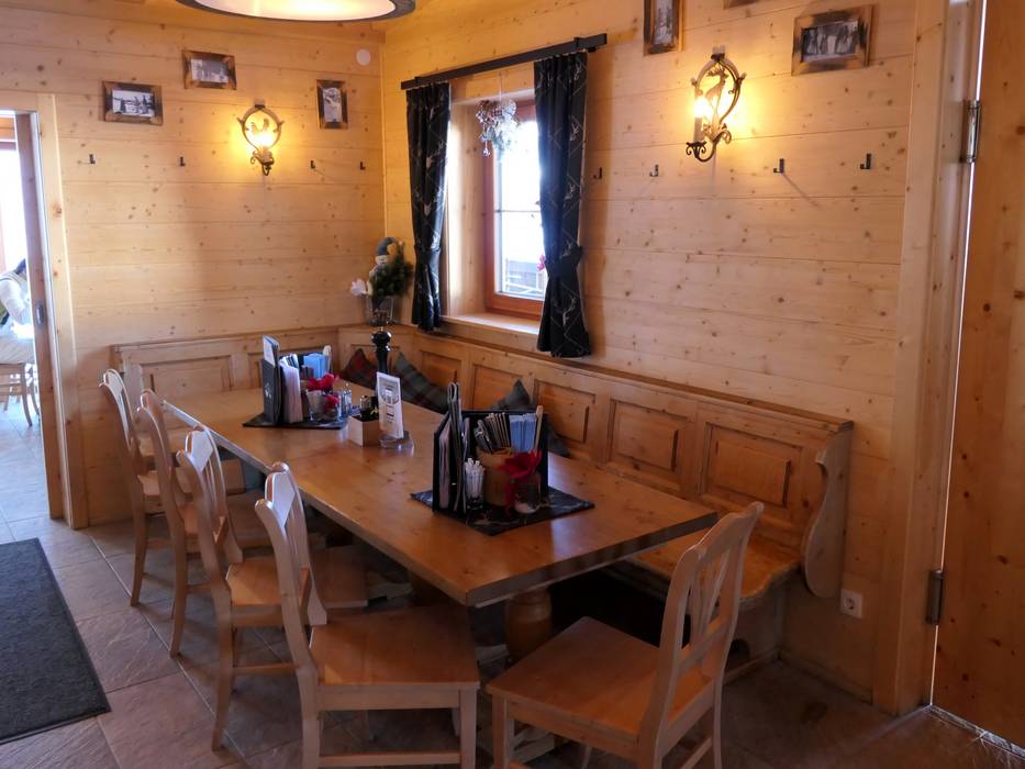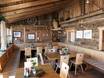 Die Berghütte bietet typische Tiroler Speisen in einem gemütlichen Hüttenambiente. Der Ausblick von der Sonnenterrasse auf die andere Seite des Skigebiets und die Bergwelt ist grandios.