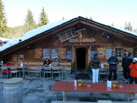In der urigen Hütte werden regionale und Schweizer Gerichte stets frisch und saisonal zubereitet. Die verschiedenen Rösti sollte man sich hier nicht entgehen lassen. Auch am Abend ist die Tegia Larnags eine gemütliche Fonduestube mit Kaminfeuer.