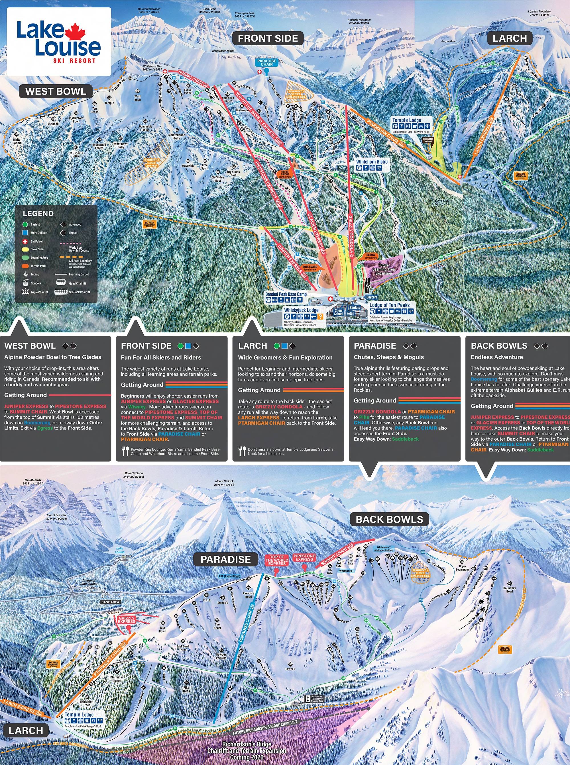 Der Pistenplan von Lake Louise zeigt mehrere Seiten des Skigebiets: die Gesamtübersicht, die Front Side, West Bowl, Larch und die Back Side mit den Back Bowls. Alle Abfahrten sind mit Nummern, Namen und Schwierigkeitsgrad im Plan angegeben. Die Lifte findet man ebenfalls mit Details.