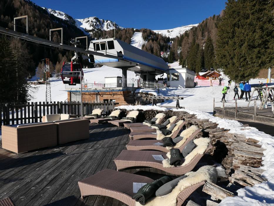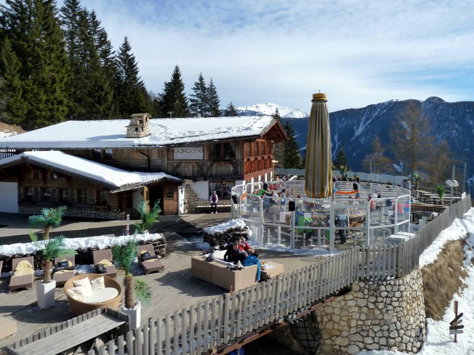 Bevor es mit der Gondelbahn ins Tal nach Predazzo geht, kann man in der Baita Gardoné unter (künstlichen) Palmen im Liegestuhl die Sonne genießen oder in der Schirmbar feiern.