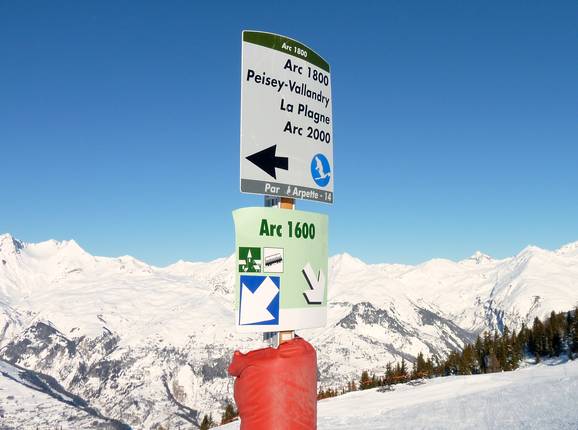 Besonders am Nordwesthang des Gebiets ist es manchmal schwierig, sich zwischen den zahlreichen parallel verlaufenden Abfahrten zu den verschiedenen Orten am Fuß von Les Arcs zu orientieren. Ein vorbildliches Beschilderungssystem schafft Abhilfe: Alle Kreuzungen und Abzweigungen sind einheitlich beschildert mit Namen und Schwierigkeitsgrad der Abfahrt und den darüber zu erreichenden Liften und Orten. Die Schilder sind übersichtlich gestaltet und kaum zu übersehen. An den Pistenbegrenzungsstöcken steht in regelmäßigen Abständen der Name der jeweiligen Abfahrt. Große Übersichtstafeln sind zudem an allen Knotenpunkten des Gebiets angebracht, an den wichtigsten informieren grüne und rote Lampen über den Öffnungsstand der Bahnen und Abfahrten.