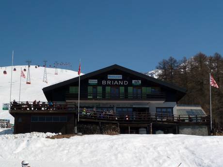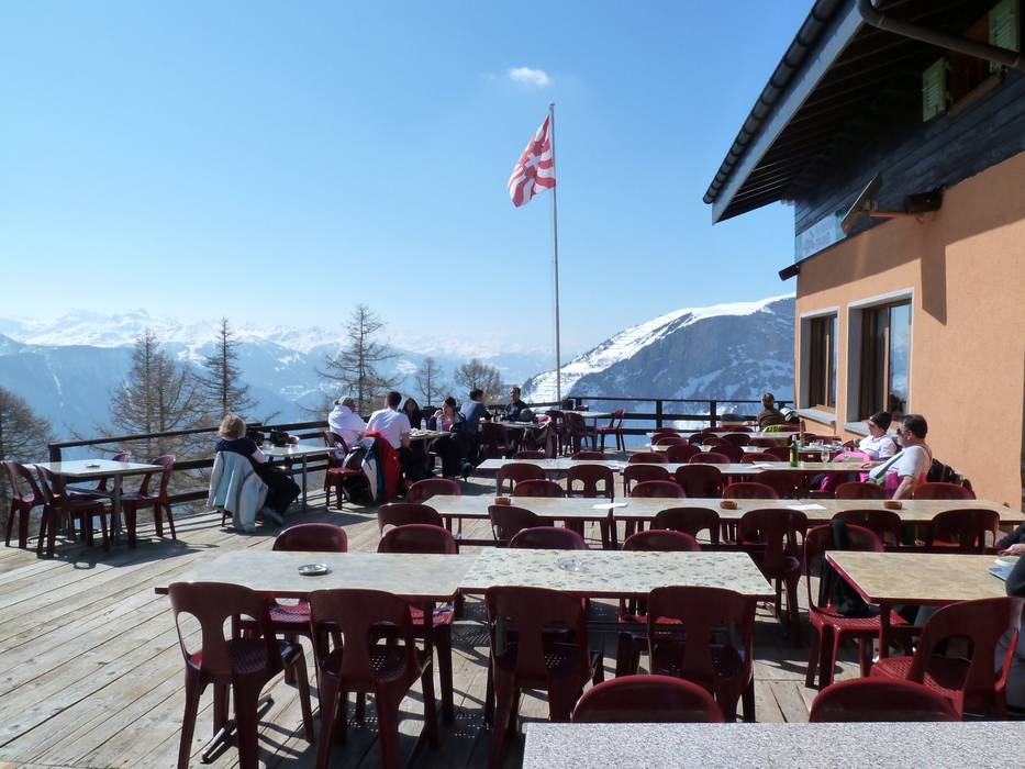 Im Skigebiet verteilt gibt es Skihütten und Restaurants mit großen Sonnenterrassen. Oft werden Walliser Spezialitäten angeboten.