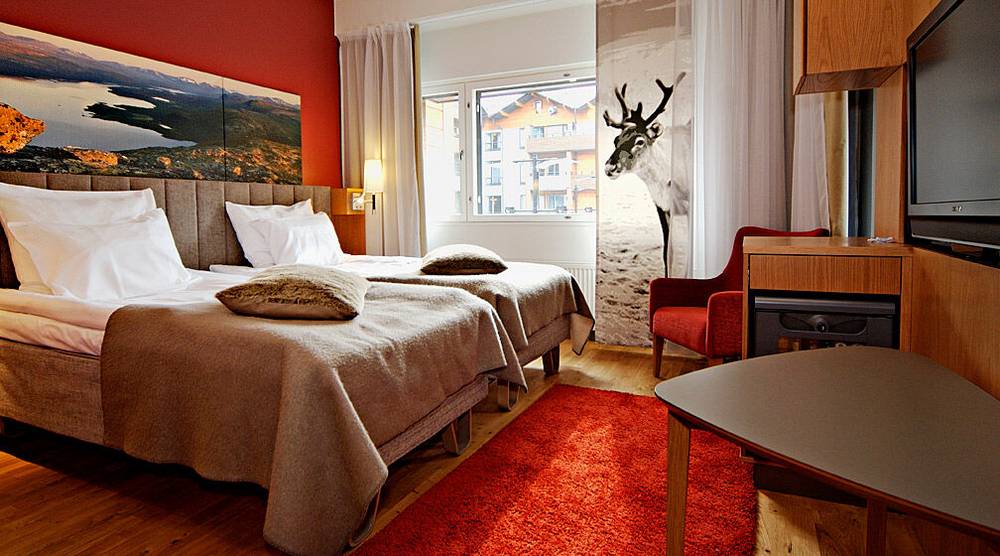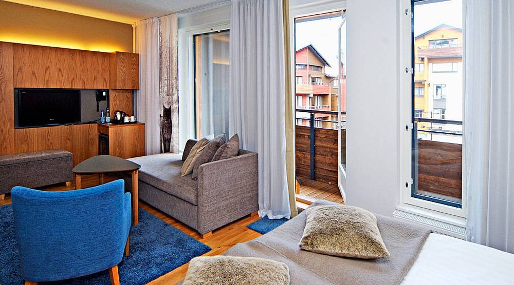 Das Innere des Hotels spiegelt den Geist Lapplands wider. Die Hotelzimmer in drei verschiedenen Gebäuden sind so dekoriert, dass sie die verschiedenen Jahreszeiten widerspiegeln. Fühlen Sie sich am wohlsten in der sommerlichen Helligkeit Lapplands, im herbstlichen Rostrot oder in den gedämpften Tönen des Winters? Die lappländische Flora und Fauna ist auch in der Ausstattung präsent, zum Beispiel in Gemälden und Vorhängen.