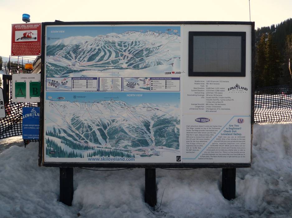 Direkt vor dem Eisenhower Tunnel befindet sich das Skigebiet Loveland. Wenn man den Highway 70 beim Exit 216 verlässt, erreicht man zuerst das Loveland Valley, wo sich eine Vierersesselbahn und eine Doppelsesselbahn, mit zumeist leichten Pisten befindet. Etwa eine Meile weiter befinden sich die Parkplätze und die Lifte vom Loveland Basin.