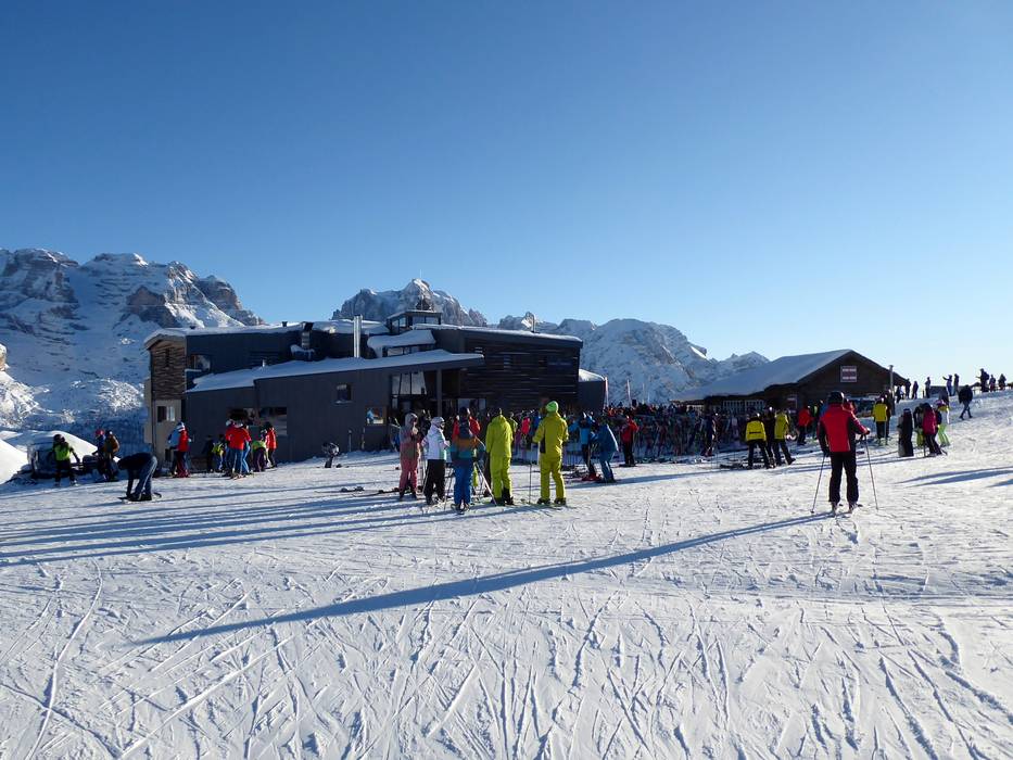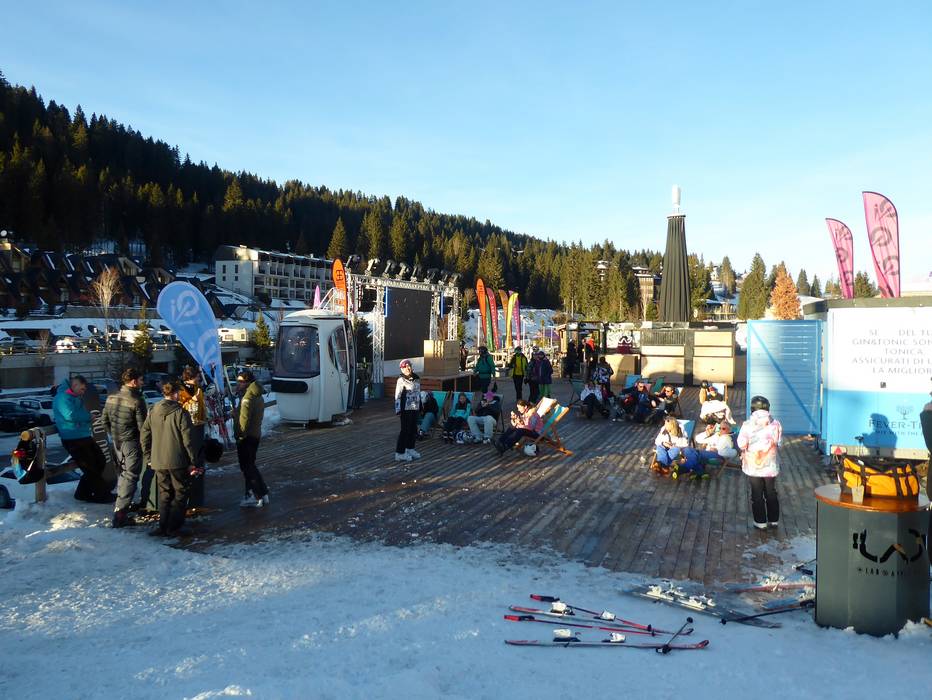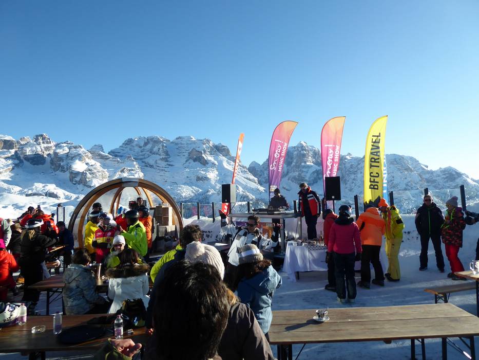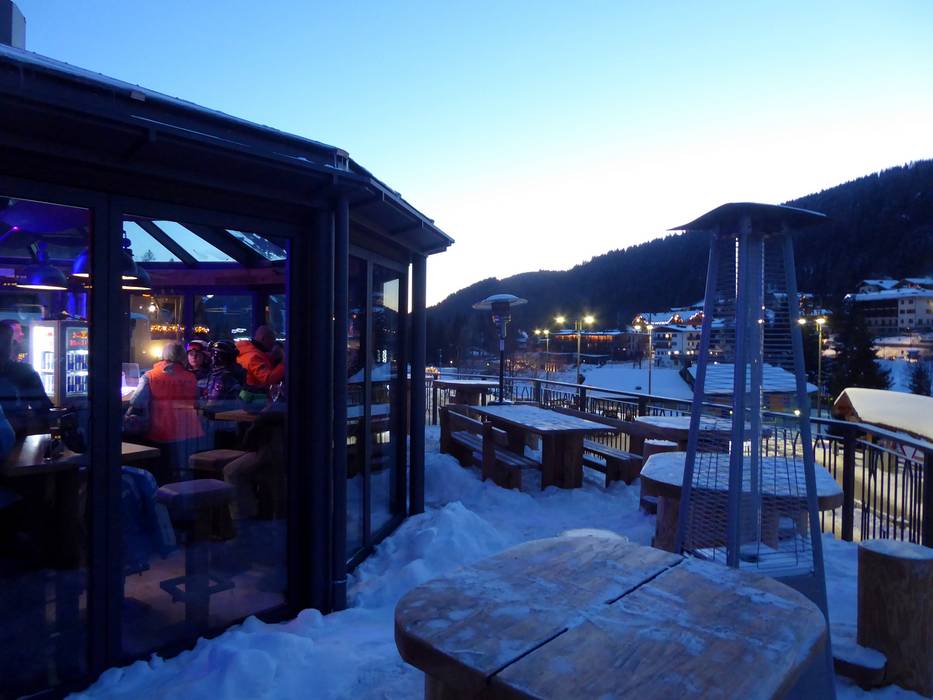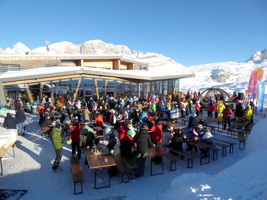 Der Treffpunkt in Madonna di Campigli. Im Ober1 kann man den Skitag sehr gut ausklingen lassen. Bei fetziger Musik und guter Stimmung kann es schon mal länger werden. Man kann auch gemütlich im Freien sitzen und den Blick auf Madonna di Campiglio genießen.