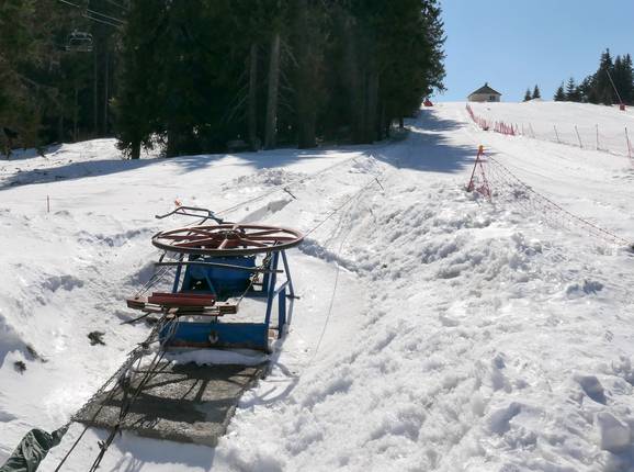 An der Bergstation surrt ein Seillift. Skikurse werden angeboten. Bei ausreichendem Schnee können neben der anspruchsvollen Hauptpiste leichte Pisten befahren werden.