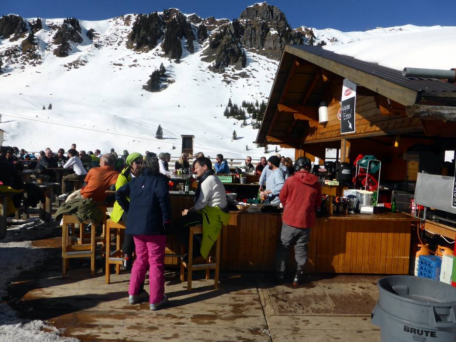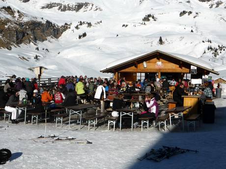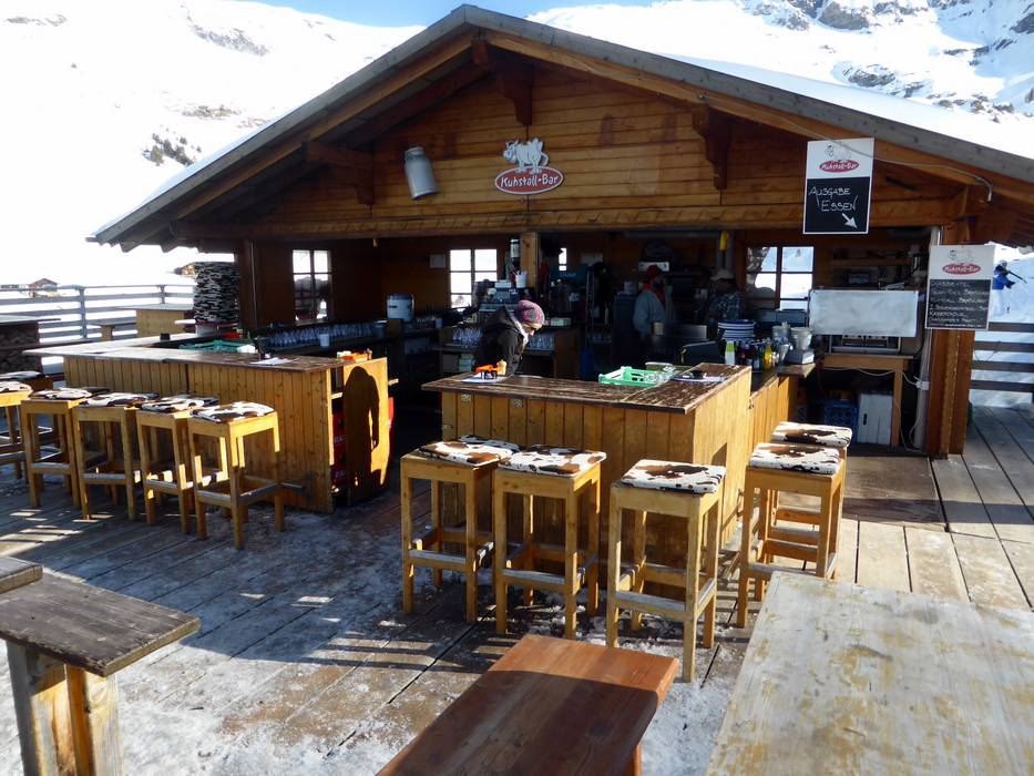 Die Kuhstallbar auf der Mägisalp ist einer der Treffpunkte im Skigebiet. Stimmungsmusik und eine große Sonnenterrasse sorgen hier für gute Laune.