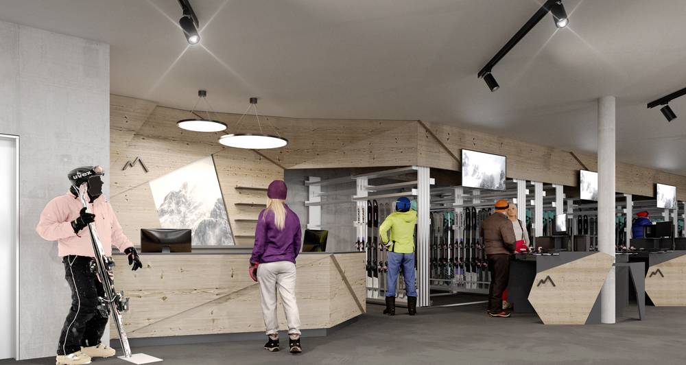 Das einstöckige Gebäude beherbergt im Erdgeschoß auf rund 370m2 einen Sportshop, einen Ski- und Bikeverleih, eine Werkstatt, ein Stehbistro mit SB-Automaten, Ticket-Kassen und Abholautomaten. Im 260m2 großen Obergeschoß befinden sich Mitarbeiterräume, eine Lounge für Busfahrer sowie Technik- und Lagerräume. Weiters ist im Obergeschoß auch Platz für einen zweiten Shopbereich vorgesehen. Der Skiverleih ist mit modernsten Geräten ausgestattet. Im Shop finden qualitativ hochwertige Artikel Platz.2019/2020