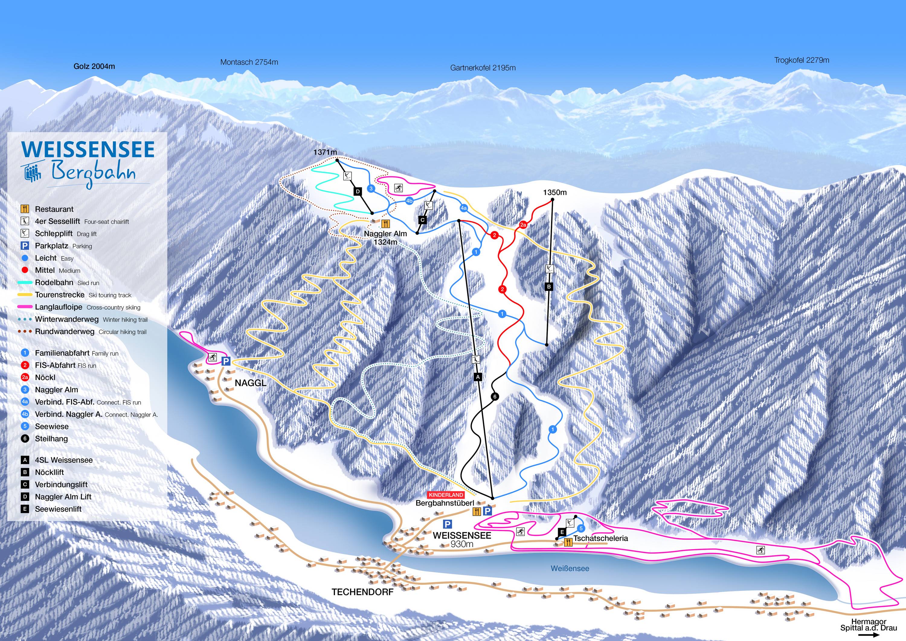 Techendorf (1 km), Weissensee (1,5 km), Naggl (3,3 km) Orte am Skigebiet