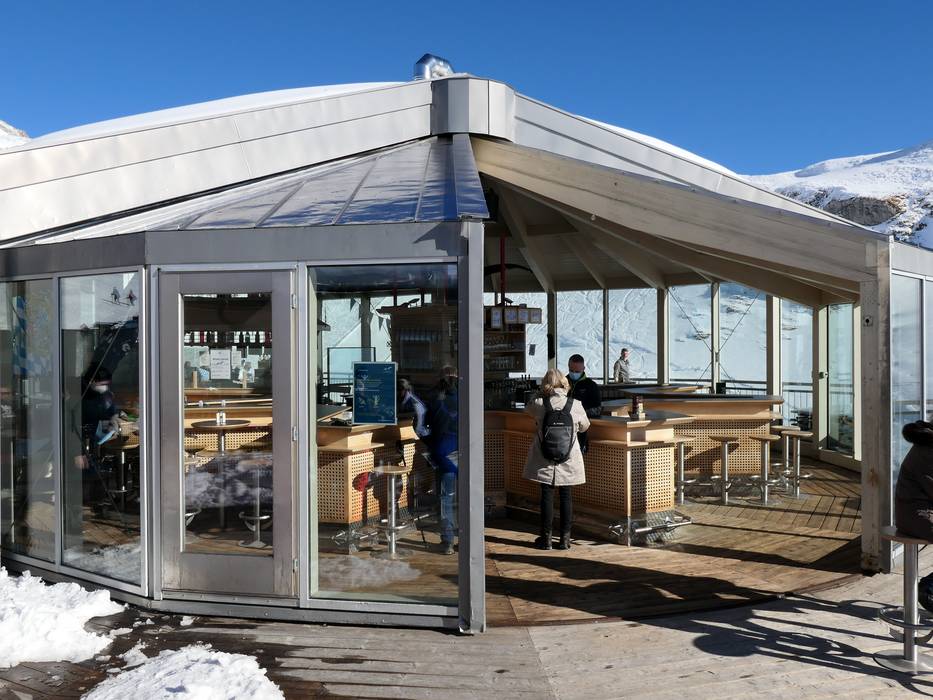 Die moderne, gläserne Panoramabar ist seit Jahren einer der Lieblingsplätze der Gäste. Hier gibt es köstliche Kleinigkeiten und Getränke für die gemütliche Après-Ski-Stimmung.