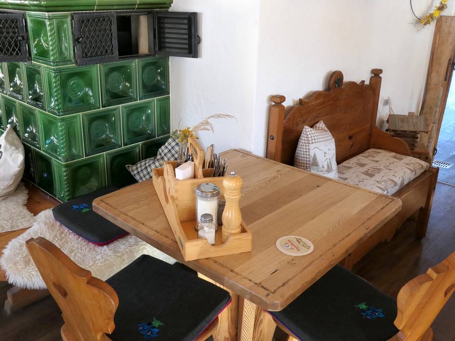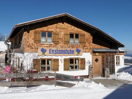 Die gemütliche Hütte verwöhnt mit Allgäuer Spezialitäten. Die große Sonnenterrasse und die gemütlichen Gaststuben laden zum Verweilen ein. Die Enzianstube ist auch beim Nachtskifahren geöffnet.