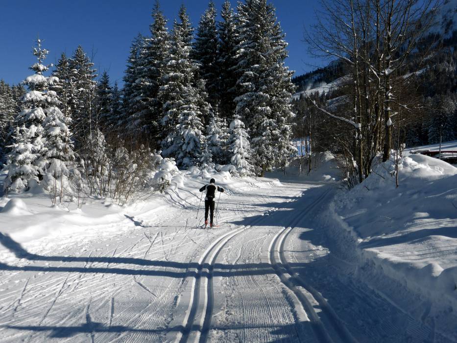 Auf dem Ski-Trail Allgäu-Tirol führen Doppelspur- und Skating-Langlaufloipen von Oberjoch nach Österreich ins Tannheimer Tal und nach Jungholz. Wer sich von der Dunkelheit nicht ausbremsen lassen möchte, findet eine 1,5 km lange Flutlichtloipe an der Hornbahn in Bad Hindelang.