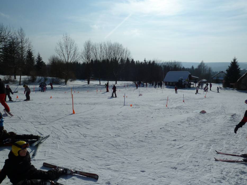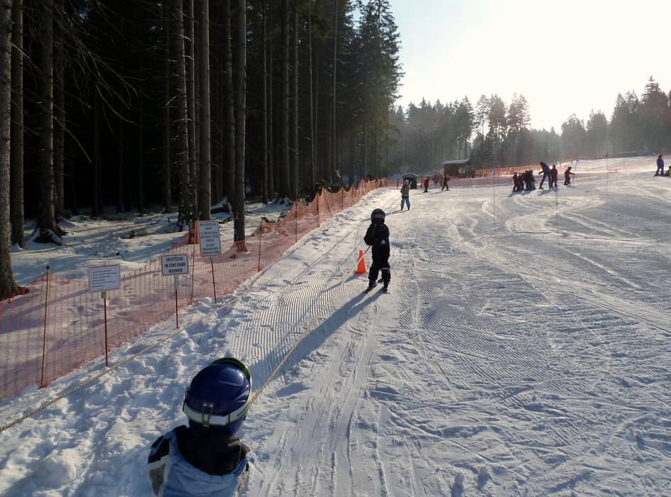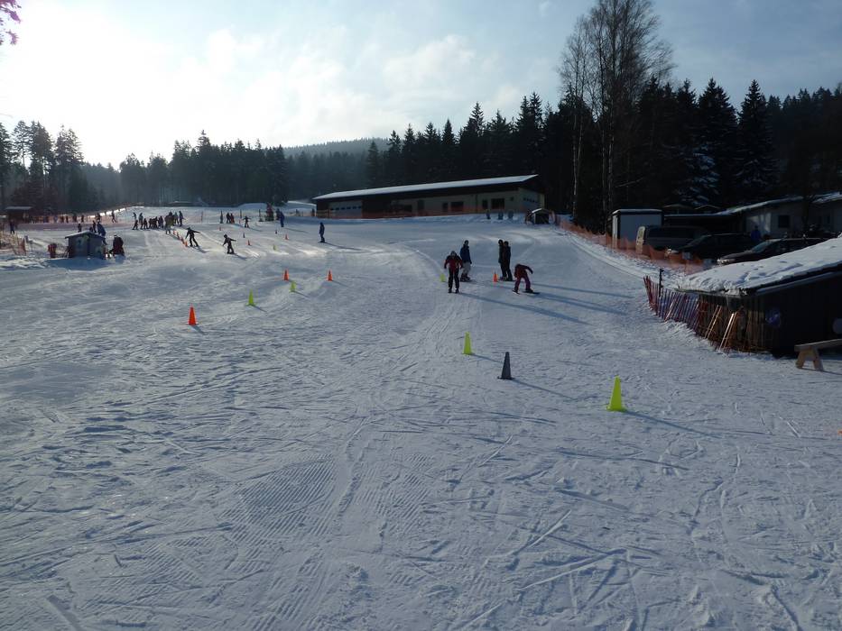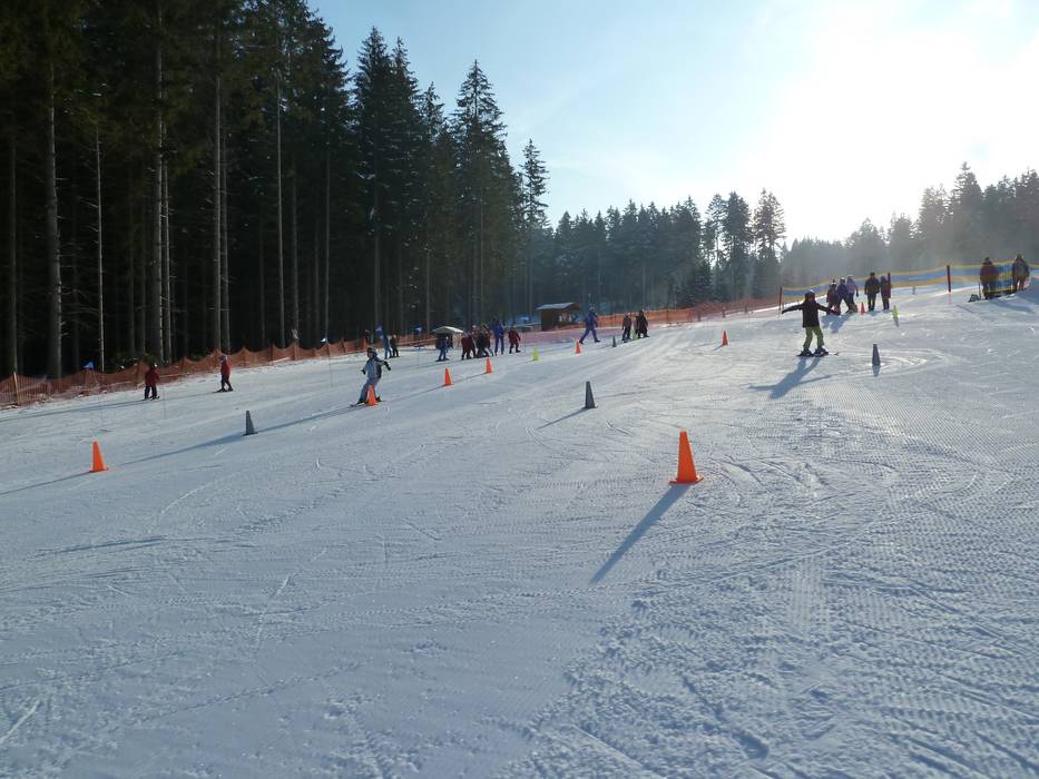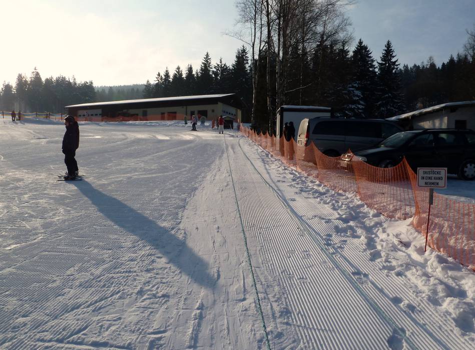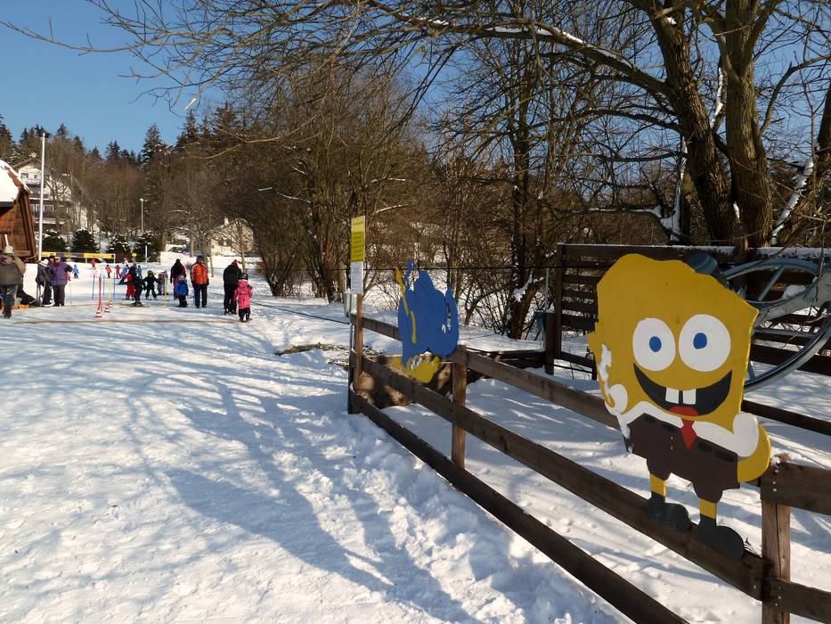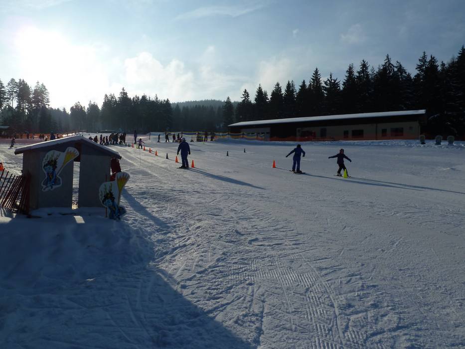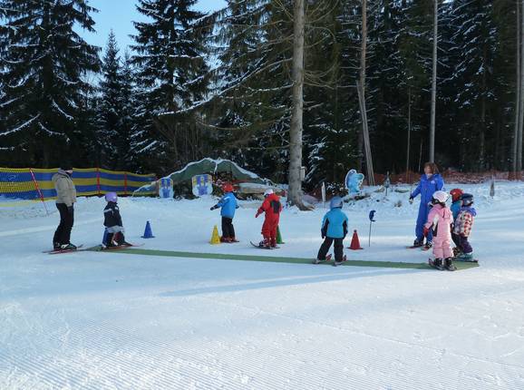 An der Talstation Ochsenkopf Süd befindet sich die Fleckiworld der Skischule Hottenroth mit zwei Seilliften. Juhuu der Elch bringt den Kleinen spielend das Skifahren bei.