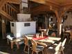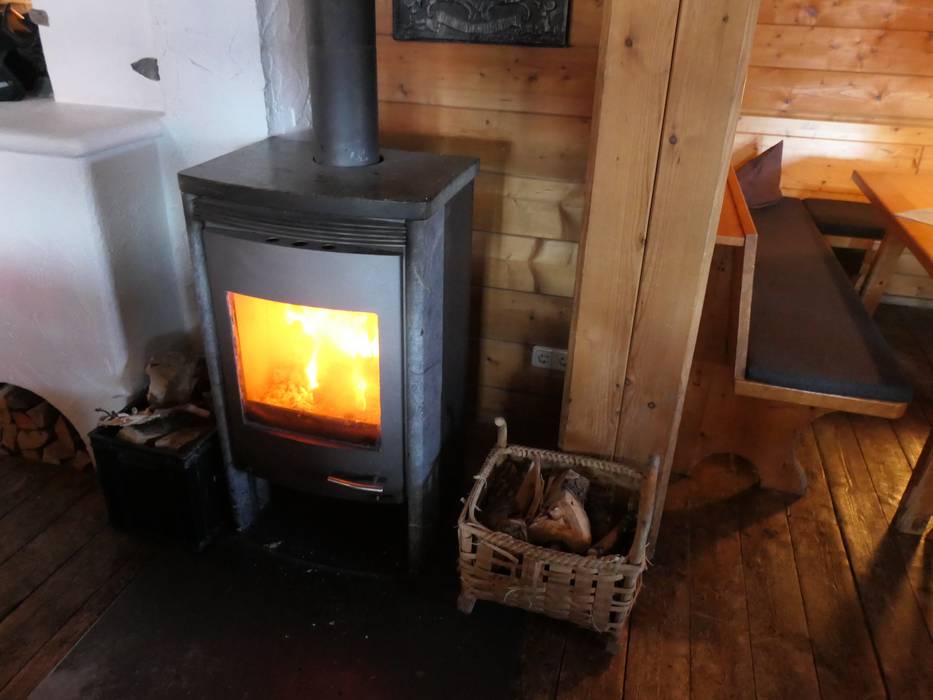 Kleine gemütliche Hütte mit einigen Sitzmöglichkeiten innen am Ofen und großer Terrasse.