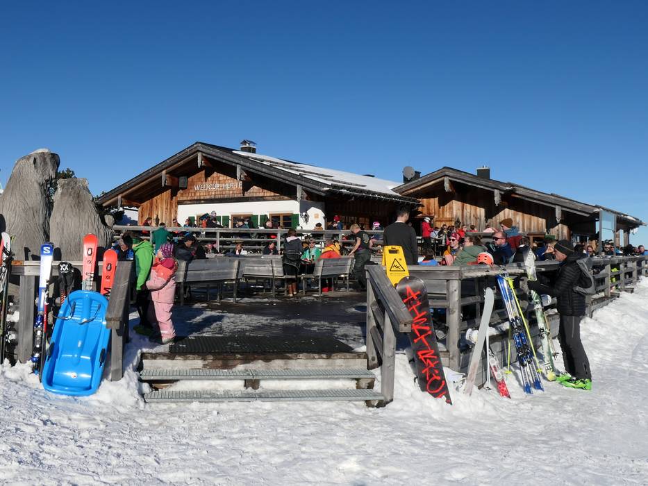 Direkt an der Weltcup-Piste ist die Aussicht auf der Sonnenterrasse traumhaft schön. Kulinarisch verwöhnt die Hütte mit herzhaften Allgäuer Schmankerln und süßen Köstlichkeiten.