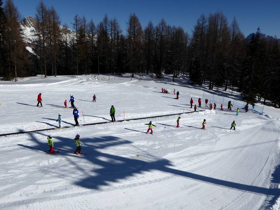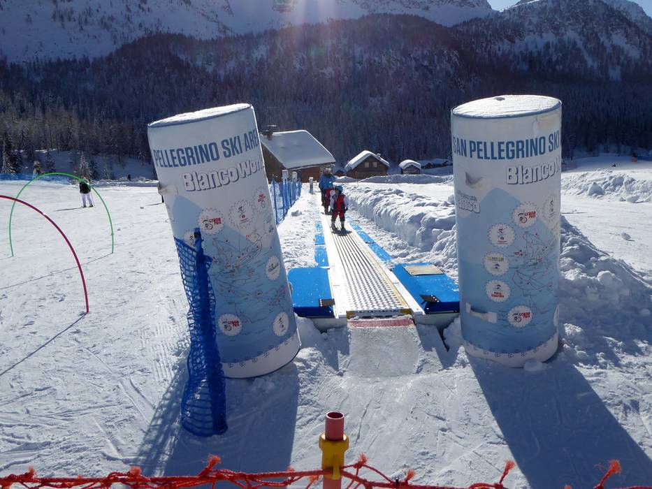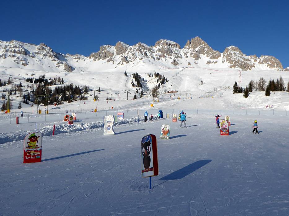 Die Skischule "Scuola italiana Sci e Snowboard Moena Dolomiti" betreibt das große Kinderland am Passo San Pellegrino. Zwei Zauberteppiche und lustige Figuren machen das Skifahren lernen zum Kinderspiel.