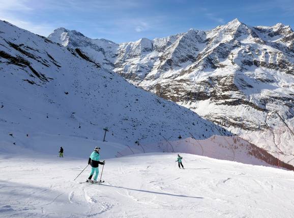 Familienskigebiet Pfelders Sesselbahn Karjoch mit breiten Pisten Abendstimmung an der Bergstation Karjoch Herrliches Panorama am Gampenlift in Pfelders
