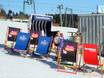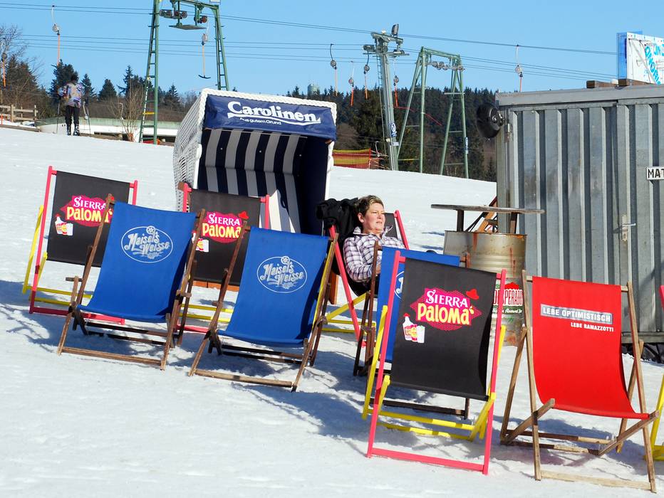 Wer hier versackt muss hinterher ein Stück aufsteigen, denn die Schirmbar steht mitten auf der Piste, etwas unterhalb der Bergstationen. Bei Sonnenschein werden Liegestühle rausgestellt.