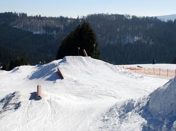 Funpark an der Oberen Postwiese mit Kicker, Rails, Corner und vielem mehr. Mehrfacher Austragungsort der Chillanddestroy-Snowboard-Tour - bester Funpark in der Wintersport Arena.