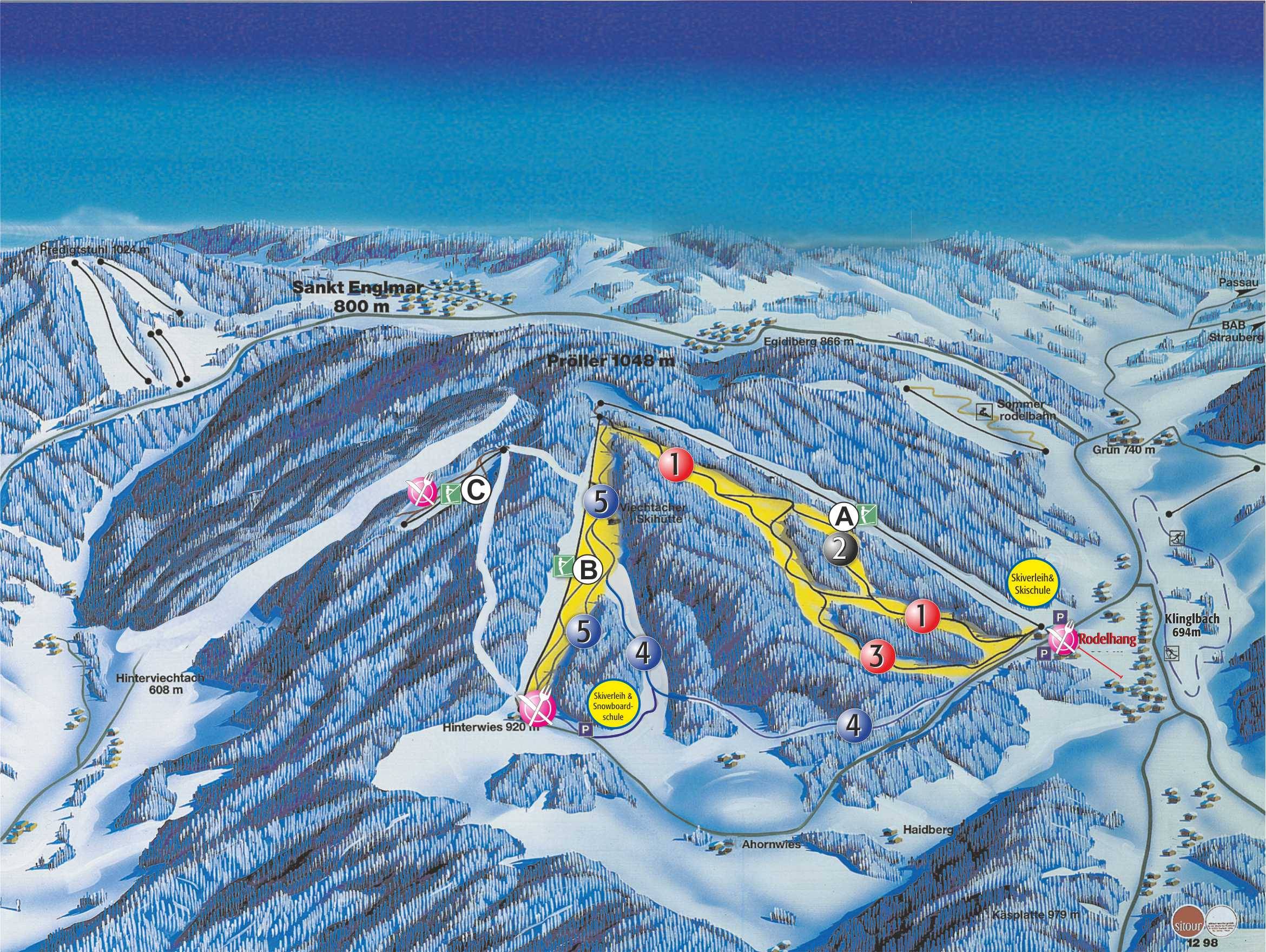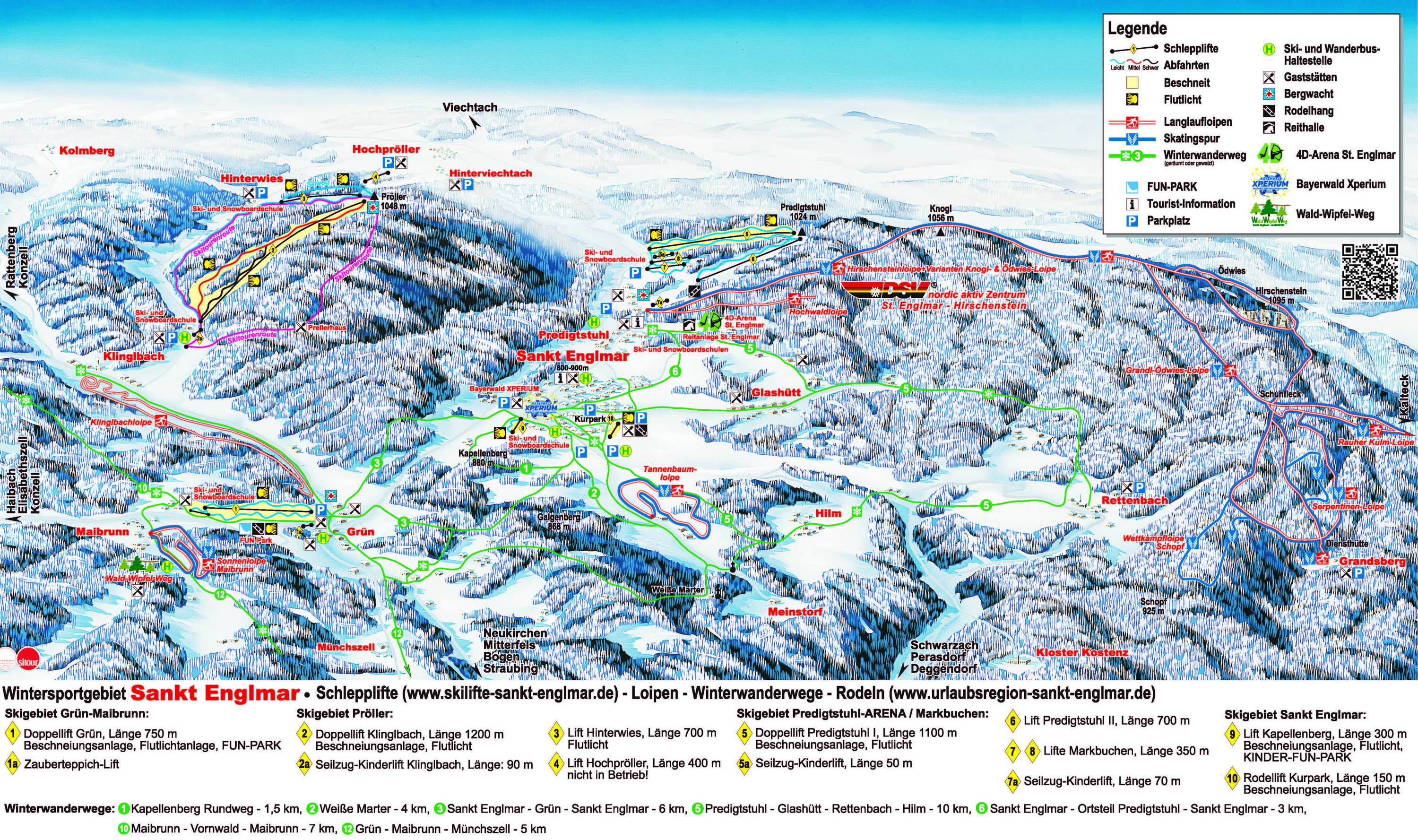 Das Skigebiet Pröller hat einen eigenen Pistenplan. Der Pistenplan ist klar, detailliert und informativ. Die Namen der Einkehrmöglichkeiten könnten ergänzt werden. Auf dem Winterplan der Ferienregion St. Englmar ist das Skigebiet ebenfalls grundlegend dargestellt.