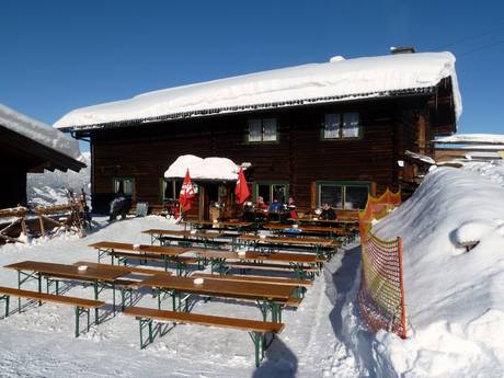 Eine der urigsten Hütten in der Skischaukel Radstadt-Altenmarkt. Es werden deftige regionale Spezialitäten serviert. Vor der Hütte kann man im Sonnenstuhl relaxen.