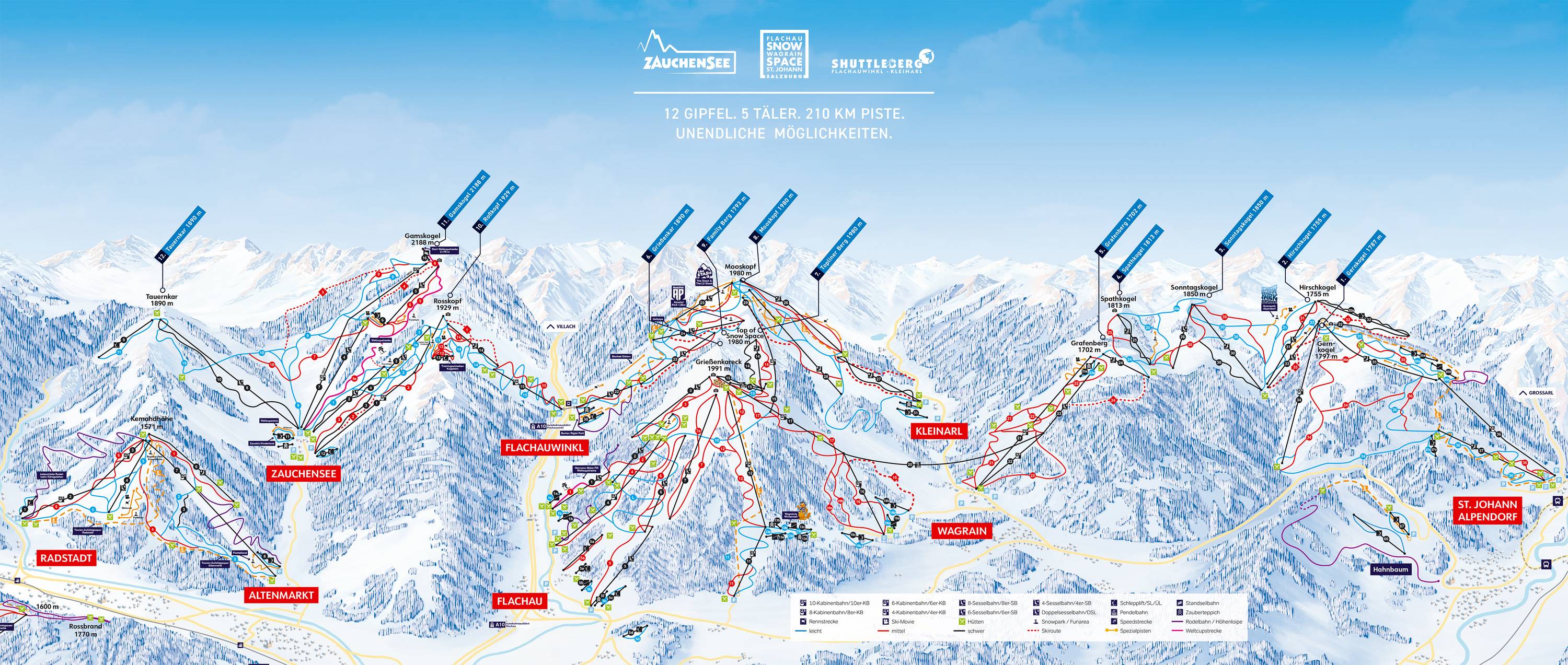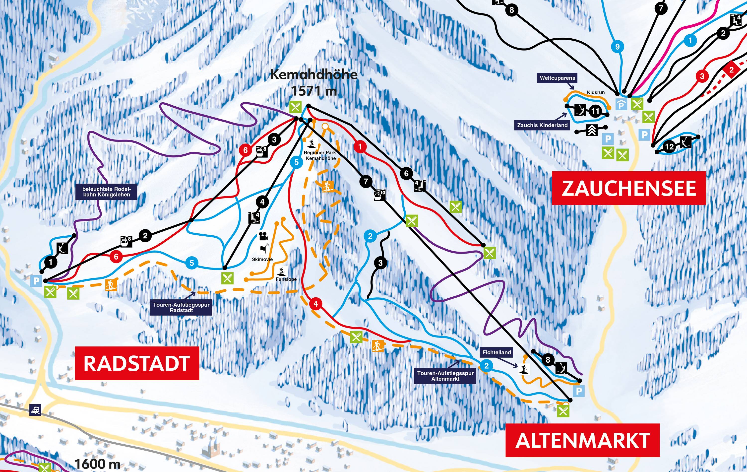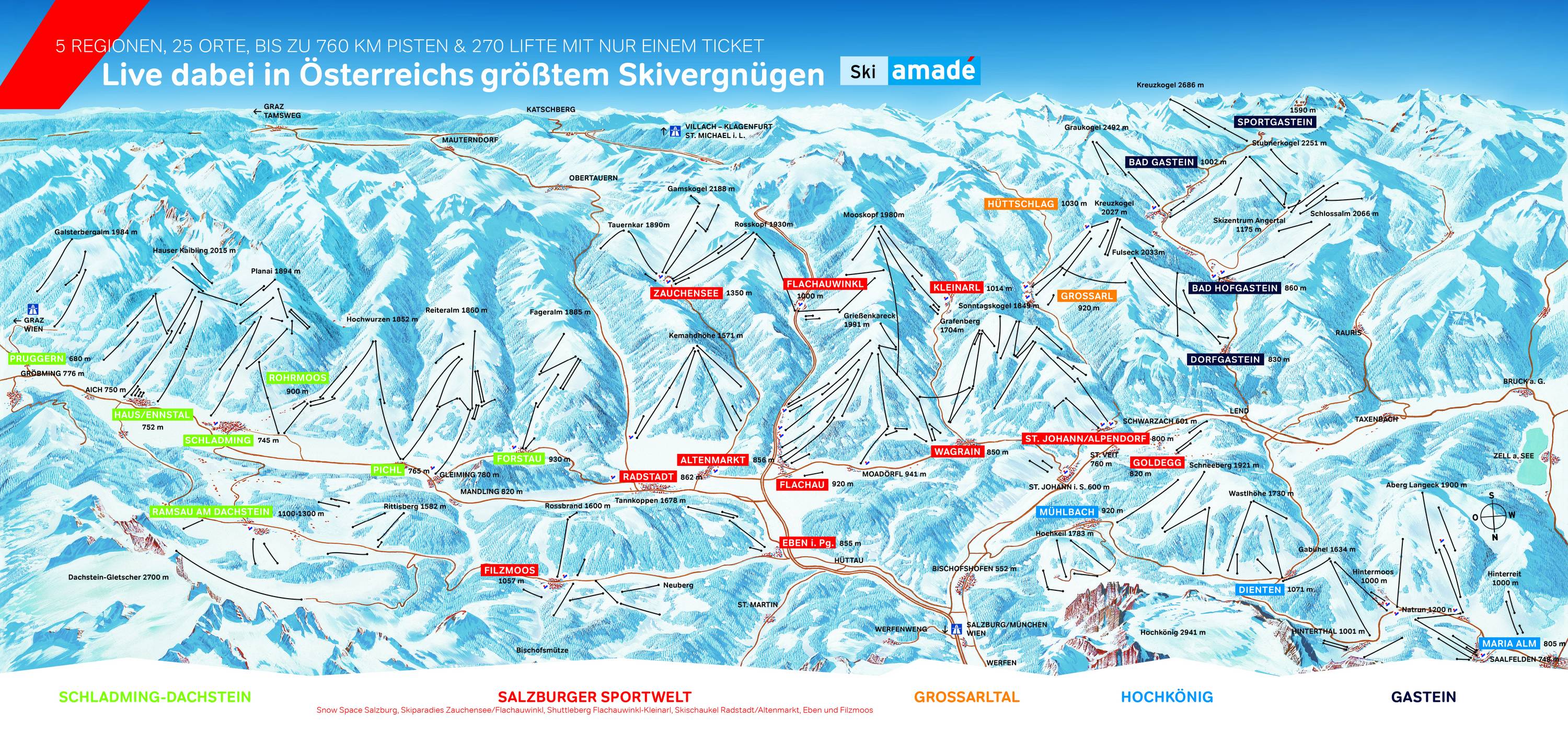 Der Pistenplan stellt das Skigebiet gut dar. Es sind alle Lifte und Hütten mit weiterführenden Informationen eingezeichnet und beschrieben. Die Pisten sind alle dargestellt, aber nicht im Detail beschrieben. Auf der Rückseite befindet sich der Pistenplan von Zauchensee. Ebenso ist das Skigebiet in den Pistenplänen von Ski amadé mit integriert.