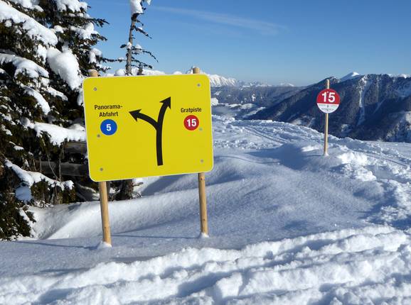 Große Informationstafeln informieren die Gäste an den wichtigen Punkten im Skigebiet. Die Ausschilderung ist klar und sehr gut. Man findet sich im Skigebiet sehr gut zurecht.