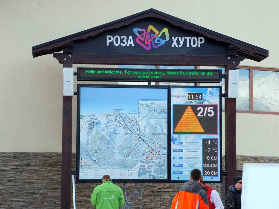 Große Informationstafeln mit elektronischer Anzeige geöffneter Lifte und Pisten finden sich an den strategisch wichtigen Punkten des Skigebiets. Die Beschilderung der Pisten ist ausbaufähig. Positiv: Sämtliche Schilder sind in russischer Sprache (kyrillische Buchstaben) und in Englisch beschriftet.
