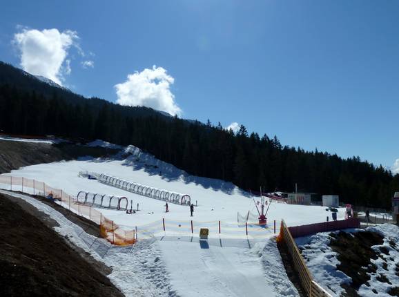 Sportis Kinderland bietet Förderbänder verschiedener Länge und einen Teller-Seillift. Der abgegrenzte Bereich liegt an der Talstation neben der Schialm und ist über eine Fußgängerbrücke erreichbar. Das Gelände ist ideal für die ersten Schritte im Schnee.