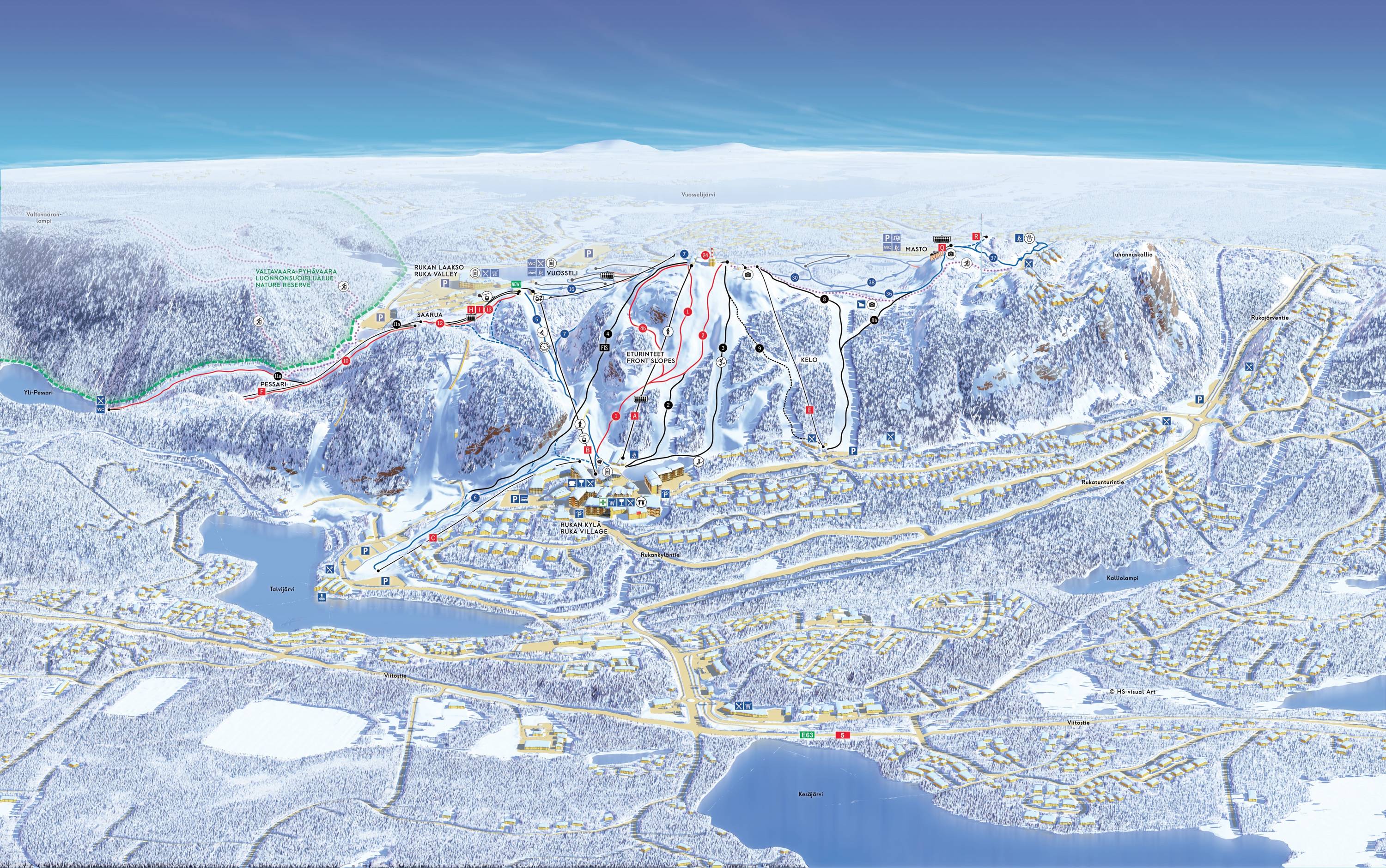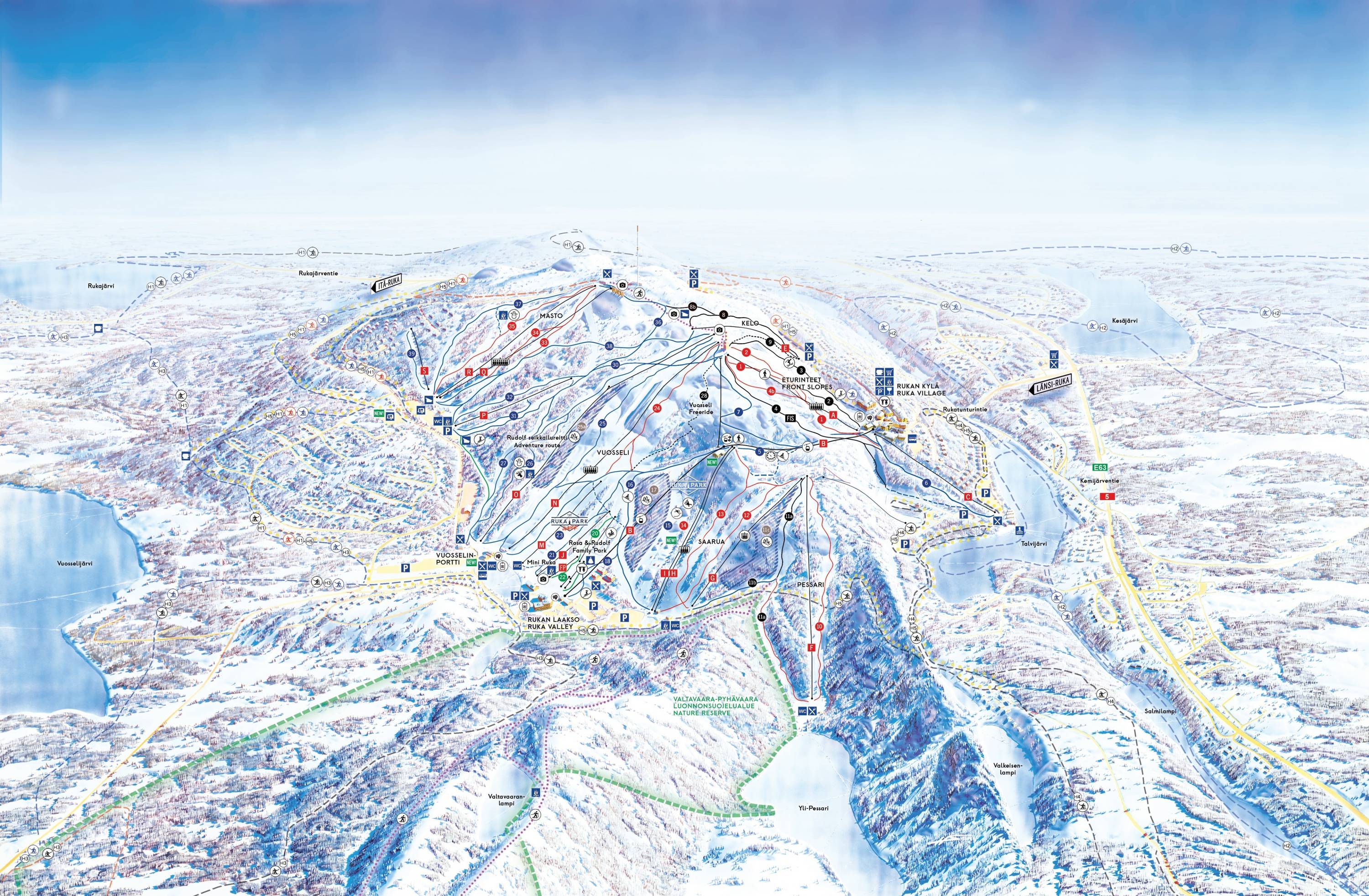 Der Pistenplan bildet das gesamte Skigebiet Ruka gut ab. Die Lifte sind mit allen Informationen angegeben. Bei den Abfahrten findet man zwar die Nummen der Piste aber nicht den Namen. Höhenangaben wären noch wünschenswert. Die Einkehrmöglichkeiten sind mit Symbolen eingezeichnet. Zusätzlich findet man Informationen zu den Kinderpisten und eine Karte vom Ruka Village.