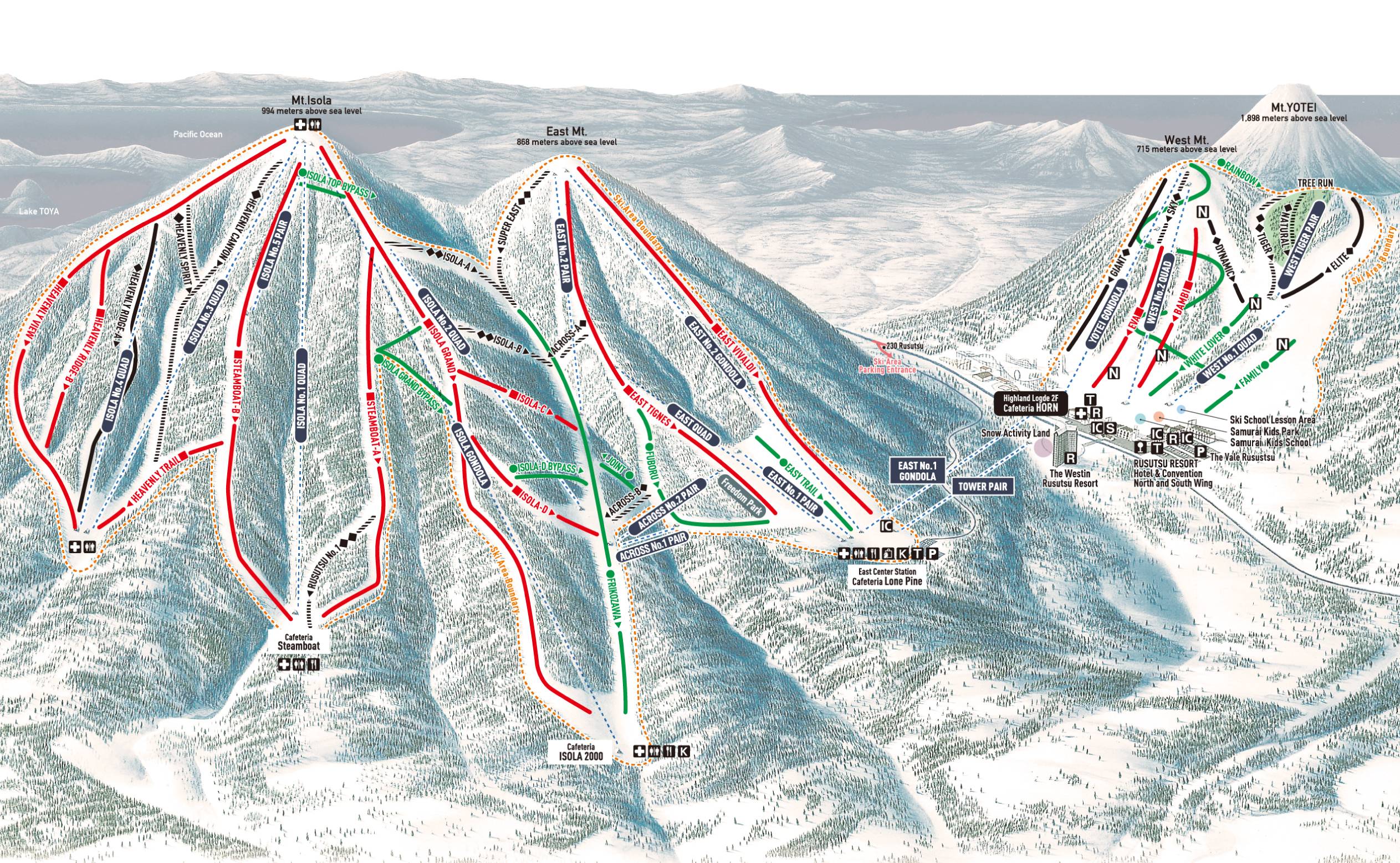 Der Pistenplan bildet das komplette Skigebiet Rusutsu sehr gut ab. Es sind alle Pisten und Lifte eingezeichnet. Man erkennt u.a. auch welche Pisten zum Nachtskifahren geöffnet sind und welche Abfahrten Buckelpisten sind. Es gibt eigene Pistenpläne in japanischer und englischer Sprache. Auf der Rückseite findet man weitere nützliche Informationen zu den Einkehrmöglichkeiten und eine detaillierte Resort-Karte.