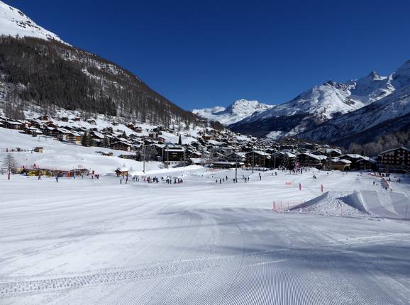 Beim Skischulsammelplatz befindet sich das Anfängergebiet von Saas-Fee mit diversen Schleppliften (Teller- und Schlepplifte) und verschiedenen Neigungen. Hier findet jedes Level die passende Piste. Oben im Skigebiet gibt es zwar auch leichte Pisten, aber diese sind nur über mittelschwere Pisten zu erreichen. Anfänger sollten die Pisten im Talboden von Saas-Fee befahren und den oberen Teil des Skigebiets den fortgeschritteneren Wintersportlern überlassen.