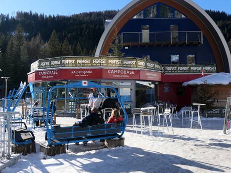In San Martino di Castrozza kann man den Skitag gemütlich bei einem Glas Wein auf den Hütten ausklingen lassen. Im Ort selber warten einige Bars für eher gemütliches Après-Ski. An der Talstation der Alpe Tognola Gondelbahn kann man im Tognola Campo Base täglich zum Après-Ski übergehen.