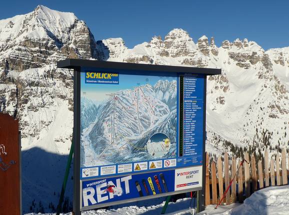 Der Pistenplan für das Skigebiet Schlick 2000 ist übersichtlich und auf dem neuesten Stand. Man kann sich damit sehr gut orientieren. Die Pisten und Lifte sind im Pistenplan einzeln gekennzeichnet und zusätzlich tabellarisch benannt. Auch die weitere Infrastruktur im Skigebiet ist leicht erkennbar dargestellt. Positiv ist auch, dass der Pistenplan als Faltplan in mehreren Sprachen zur Verfügung steht.
