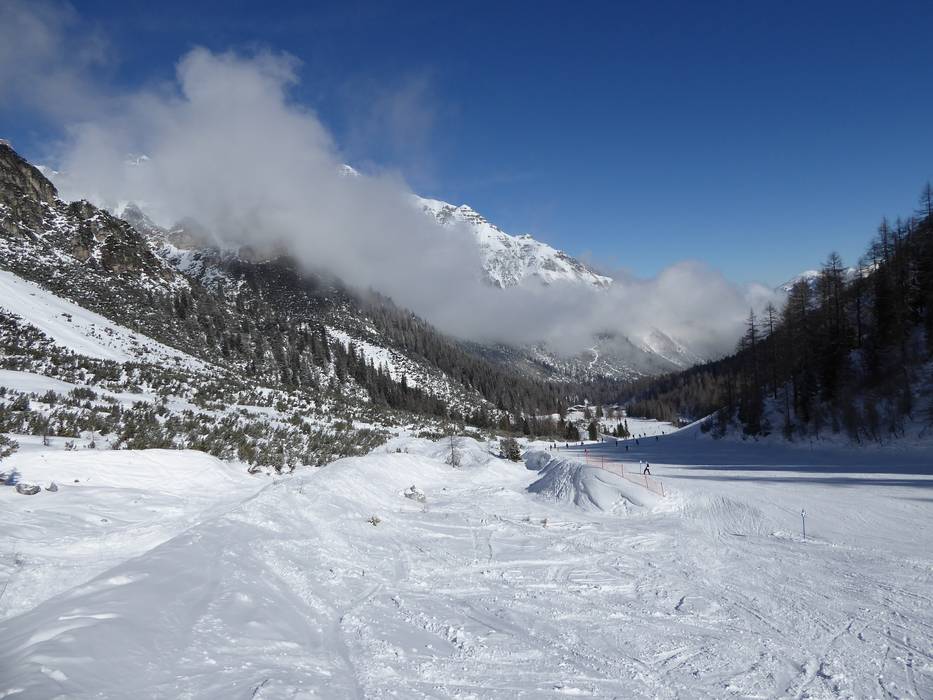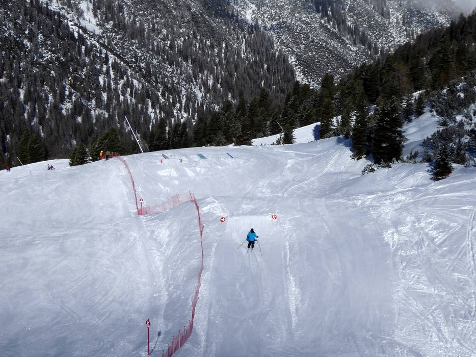 Kaum Gefälle auf der Panorama-Abfahrt zwischen der Talstation 4er-Sesselbahn Sennjoch und der Mittelstation Kreuzjochbahn. - einige Freeride-/Tiefschneegebiete