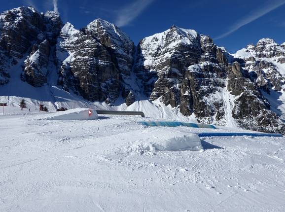 Die Free Nature Area ist eine Besonderheit. Sie wird nicht geshaped, sondern nutzt in die Hänge eingebrachte Murenschutzgräben als natürliche Halfpipe. Sie liegt am Rande der Panoramaabfahrt Talschluss unterhalb der Kalkkögel.