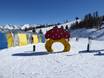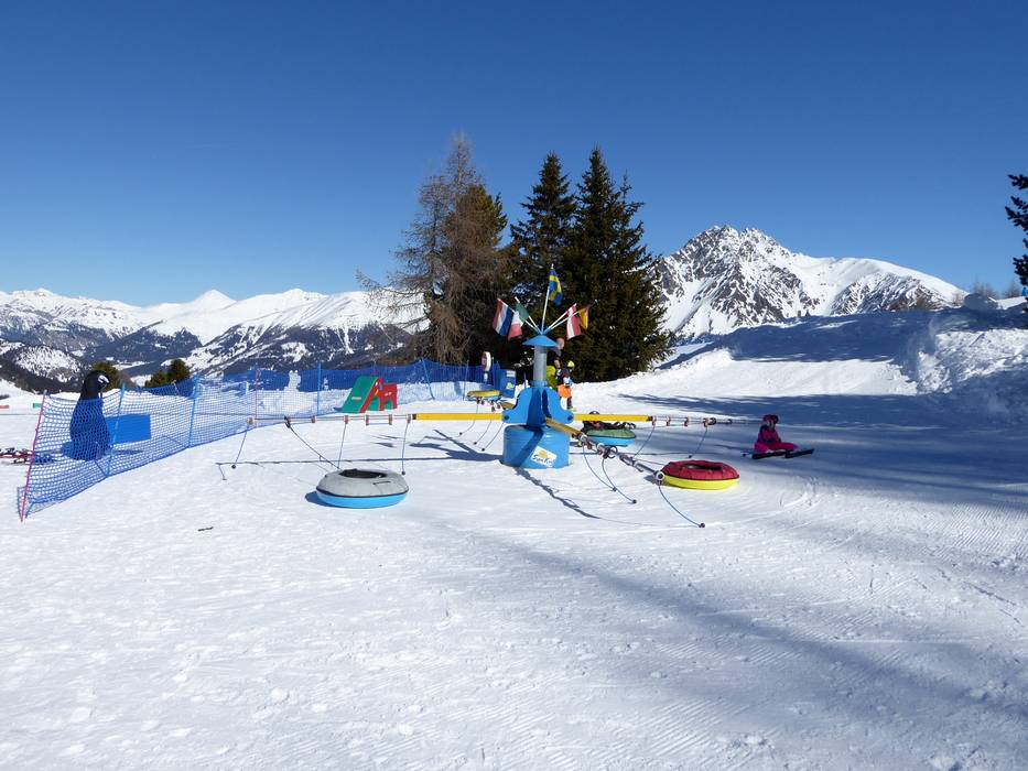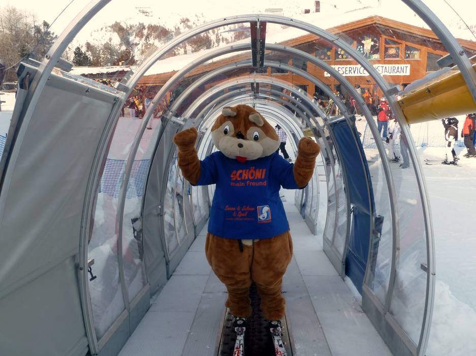 Direkt an der Bergstation der Schönebenbahn, auf 2150 m Höhe, liegt Schöni's Kinderland. Hier fühlen sich die Kleinen an den Förderbändern und am Kinderkarussell sehr wohl. Schöni besucht das Kinderland auch regelmäßig.