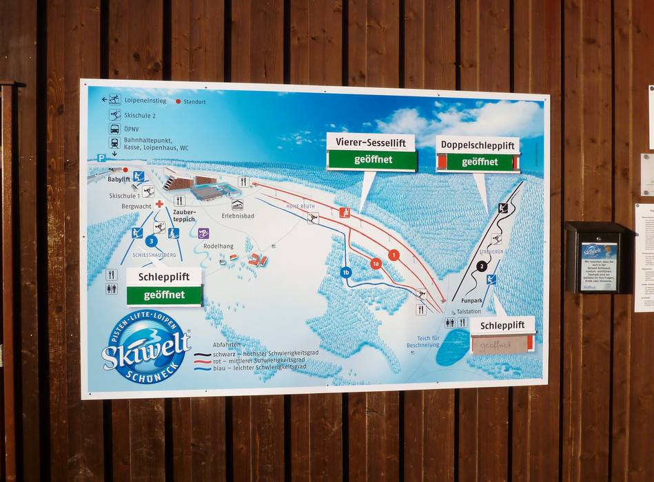 | Hinweis: Die Öffnungszeiten sind generelle Angaben vom Skigebiet Schöneck (Skiwelt) und können je nach äußeren Bedingungen, Wochentagen, Schulferien und Feiertagen variieren. | |