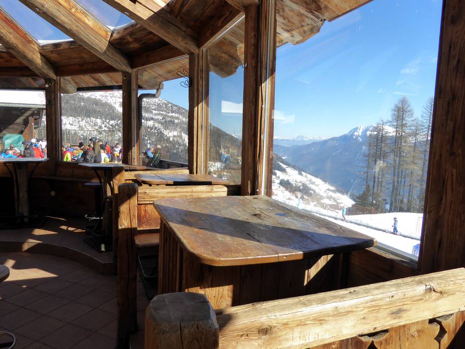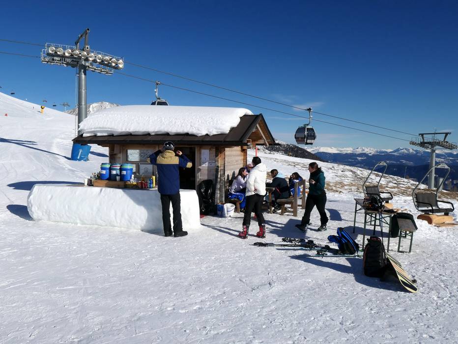 Bevor es mit der Gondelbahn ins Tal geht, kann man das Panorama bei der Schneebar genießen.