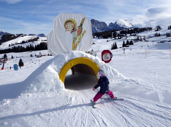 In Compatsch, leicht unterhalb der Bergstation der Gondelbahn Seis-Seiser Alm, liegt das Kinderland. Es ist sehr groß und perfekt ausgestattet.